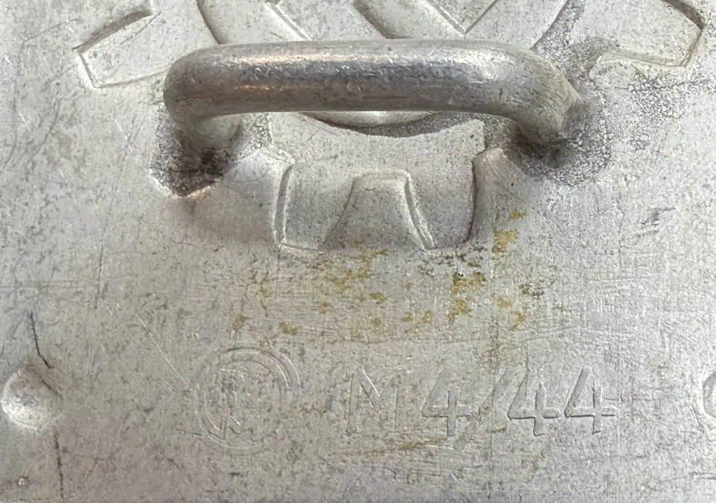RARE ORIGINAL WWII GERMAN DAF BELT BUCKLE. (Koppelschloss) Brought Home By A U.S. Veteran Certified. With the dissolution of all Free Trade Unions in Germany in May 1933 the Deutsche Arbeitsfront, (German Labor Front), was established to replace the unions and to educate the workers in industry and commerce for smooth and efficient operation of all labor in the Third Reich. In October 1934 the DAF was given official status as a sub-section of the NSDAP and in March 1936 it was recognized as an independent NSDAP affiliated association and granted control of its own monetary budget. In 1934 the first pattern of DAF uniform was introduced for DAF Werkscharen, (Work Squads), and a belt buckle was introduced in late 1935 for wear by all ranks. Die stamped, natural aluminum, box buckle features a plain field with a high relief, embossed fourteen tooth cogwheel encompassing a canted swastika to center. Buckle also has a small embossed circular bead to each corner. Reverse with brazed buckle catch, prong bar, and prongs all intact. Reverse well marked with impressed RZM logo with single circular border and, “M4/44” One of the classic SCARCE belt buckles from the third Reich in used condition. Typical light age toning plus wear during use. Nice example issued with expected storage wear. Gettysburg Museum Certified (COA) provided. Rare 100% Guaranteed to be authentic. Sold for historic purposes only. See our other pieces on our web site. Also note when browsing our web site there are several pages of items, at the bottom of the list look for other page numbers. A Classic RARE BUCKLE!