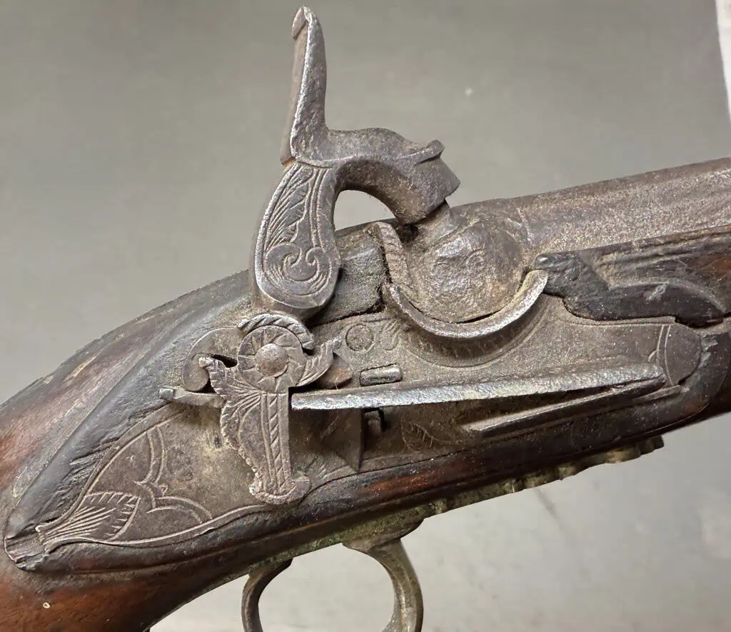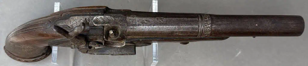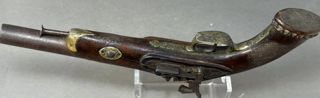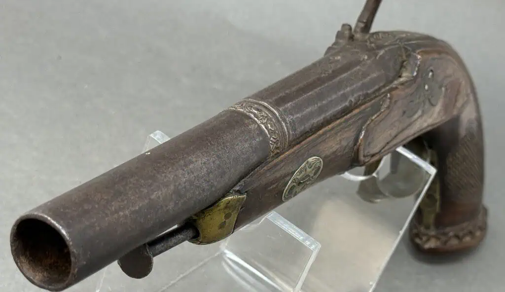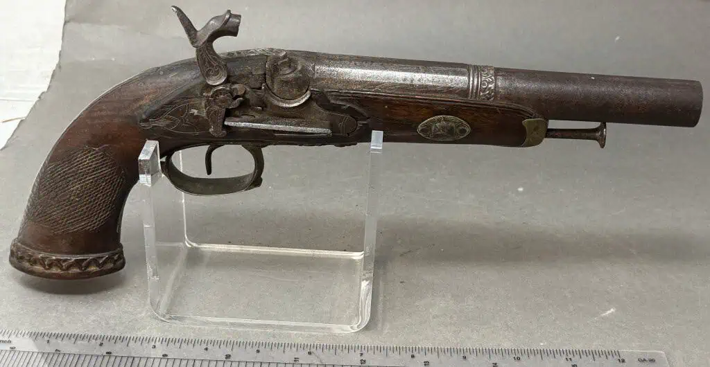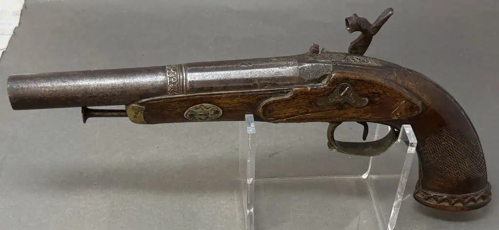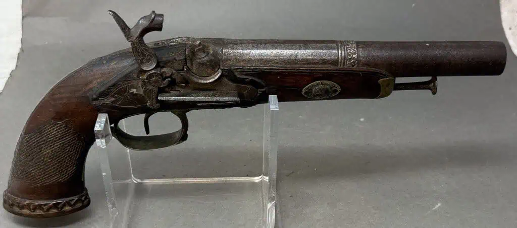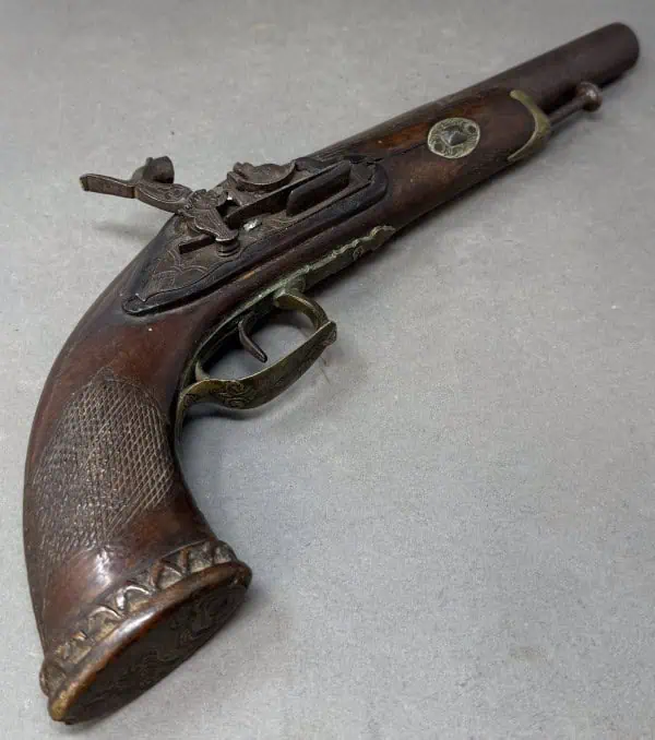 Original Civil War Period Cap And Ball .72 Caliber steel lock Antique HORSE Pistol Certified. Civil War Period monster BIG .72 caliber Cap And Ball Pistol. In Working condition Civil War period era pistol . It is a deluxe version with fancy plane wood frame and steel lock and trigger guard. This gun’s spring is tight and it does work and does fire and cock. Excellent strong spring! the lock is slightly worn but nice. Still has the ram rod . The gun is about a monster .72 caliber. . A real HAND CANNON! Many European weapons were exported to the US for sale before and during the Civil War. European made. A classic Civil War period pistol and A choice functioning display gun. A favorite of both Confederate and Union soldiers during the Civil War. Many Civil War soldiers carried private purchase “back up” weapons as illustrated in the photos. This gun is 100% guaranteed to be authentic, and unaltered. A fantastic functioning display piece. Complete museum documentation (COA) provided. This is a pre-1898 antique gun so no federal registration is required. Although this is a working gun we do not recommend firing antique guns. If you decide to shoot it, we will not be held liable for any results. You are responsible for knowing your local laws. No sales to New Jersey, New York City, D.C., or outside the United States. No Paypal payments on guns. Also note when browsing our web site there are several pages of items, at the bottom of the list look for other page numbers. Very Nice Looking Functioning Example. A REAL MASSIVE CONVERSATION PIECE!