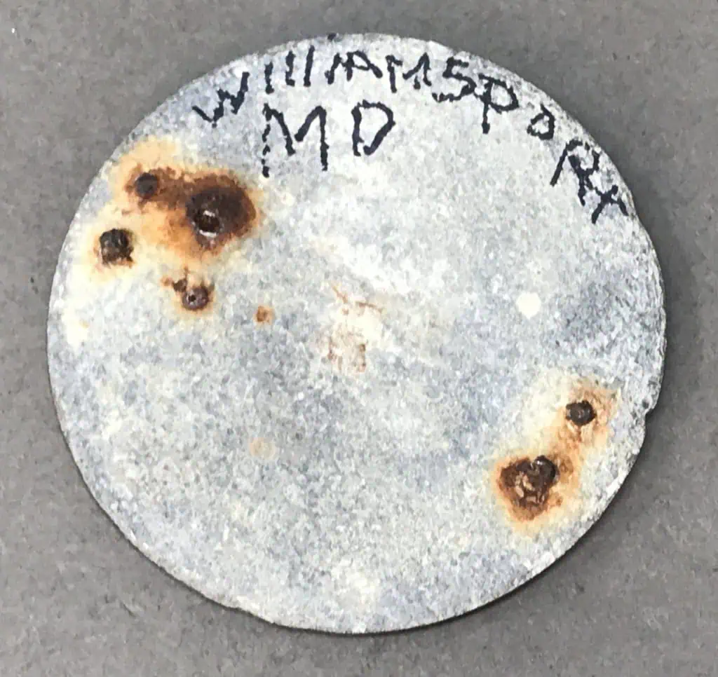 Authentic Civil War Excavated Relic U.S. Eagle Breast Plate Recovered on the Williamsport battlefield in Maryland. A dug plate for the collector who wants an authentic battlefield ground dug relic. A brown and slightly green patina. A ground dug plate from a very historical battlefield. This is an older recovered plate. A very historic recovery location. Recovered what was then off National Park property and is 100% Legal and 100% authentic. Both of the two hooks are broken, and it looks great, in good relic condition. This is one of the better early pick-up box plates from an old collection. plates this nice are very difficult to find and only come from old collections. Battlefield recovered plates with recovery history are getting very hard to find. 100% guaranteed to be authentic Gettysburg Museum certified, museum COA provided. Also note when browsing our web site there are several pages of items, at the bottom of the list look for other page numbers. Scarce location! Don’t miss this. great early pick-up! Excellent location! Antietam campaign RELICS ARE RARE AND VERY DESIRABLE!