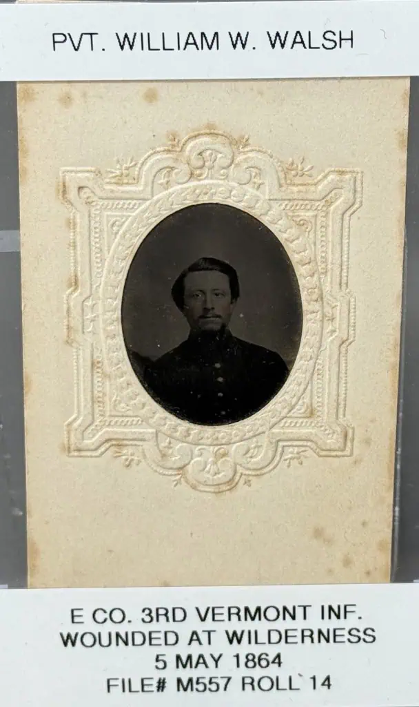 Civil War Tintype CDV size Photograph Of A Union Infantry Soldier With Frock Coat Certified. The image is I.D.ed as William Walsh of the 3rd Vermont Infantry wounded at the Wilderness. This image comes housed in a great original zCDV mat sleeve case that is in good used shape. The Soldier is with a 9 button frock coat. A great Civil War Infantry solider image. 100% guaranteed to be authentic complete with Museum COA. Don’t miss this! Nice I.D.ed Image.