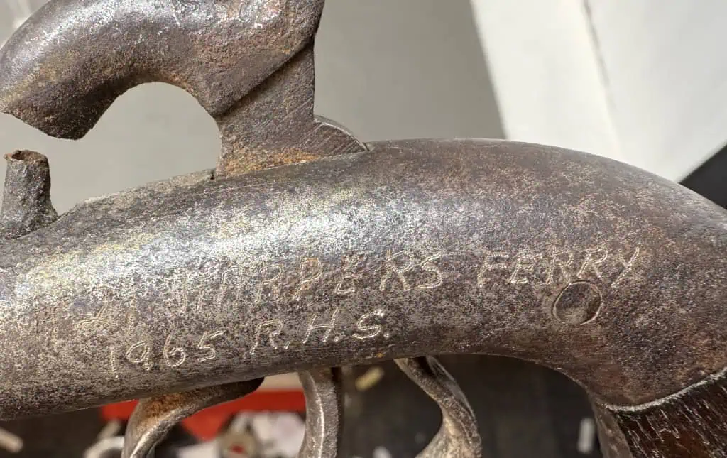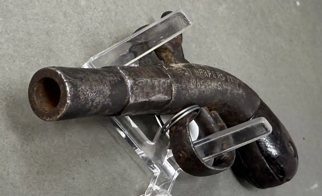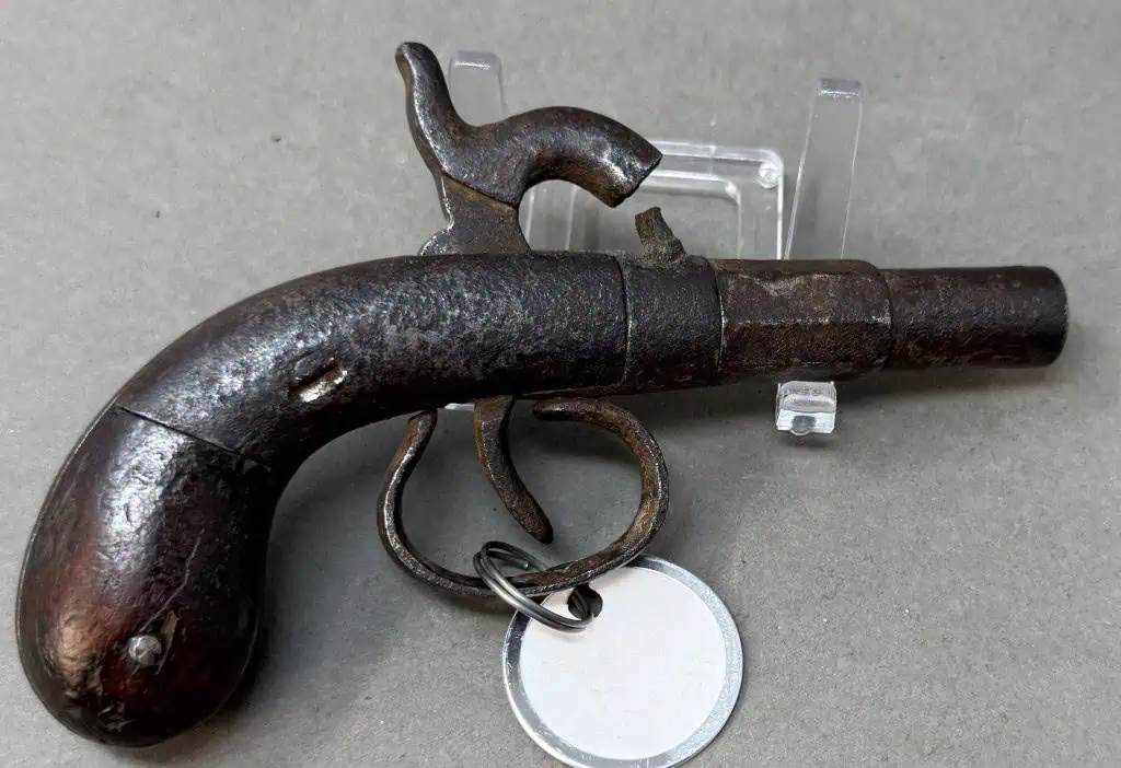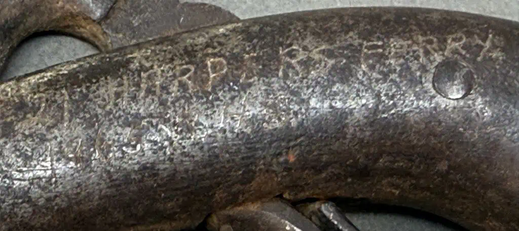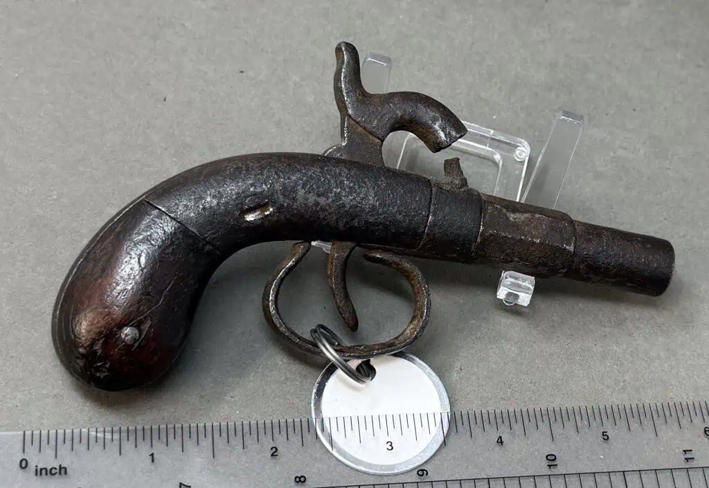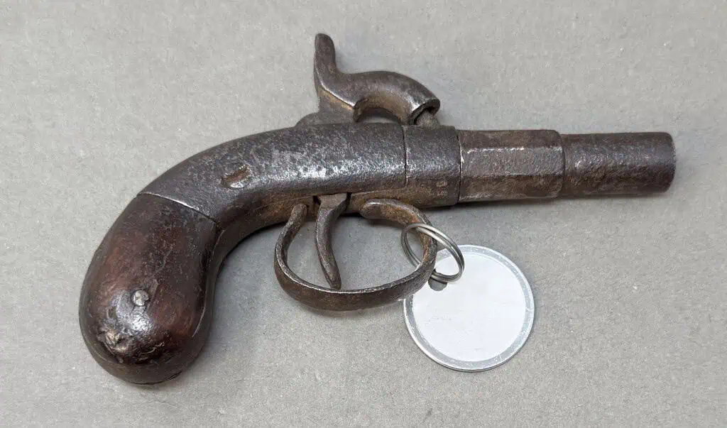 Original Civil War Period Cap And Ball .32 Caliber steel frame Antique Pistol Certified. Civil War Period .32 caliber Cap And Ball Pistol. In Working condition Civil War period model pistol. There are no numbers, so it is impossible to accurately date this one. It is a standard version with wood grips and steel frame. The spring is fair and it does work and does fire and cock if you push the trigger forward. the grips are slightly worn but nice. The gun is about .32 caliber. Many European weapons were exported to the US for sale before and during the Civil War. A classic Civil War period pistol and A choice functioning display gun. A favorite of both Confederate and Union soldiers during the Civil War. Many Civil War soldiers carried private purchase “back up” weapons as illustrated in the photos. This gun is 100% guaranteed to be authentic. A fantastic semi functioning display piece. Complete museum documentation (COA) provided. This is a pre-1898 antique gun so no federal registration is required. Although this is a non working gun, we do not recommend firing antique guns. If you decide to shoot it, we will not be held liable for any results. You are responsible for knowing your local laws. No sales to New Jersey, New York City, D.C., or outside the United States. No Paypal payments on guns. Also note when browsing our web site there are several pages of items, at the bottom of the list look for other page numbers. Very Nice Looking, Functioning Display Example. Has an engraving that leads us to believe it was recovered in Harper’s Ferry.