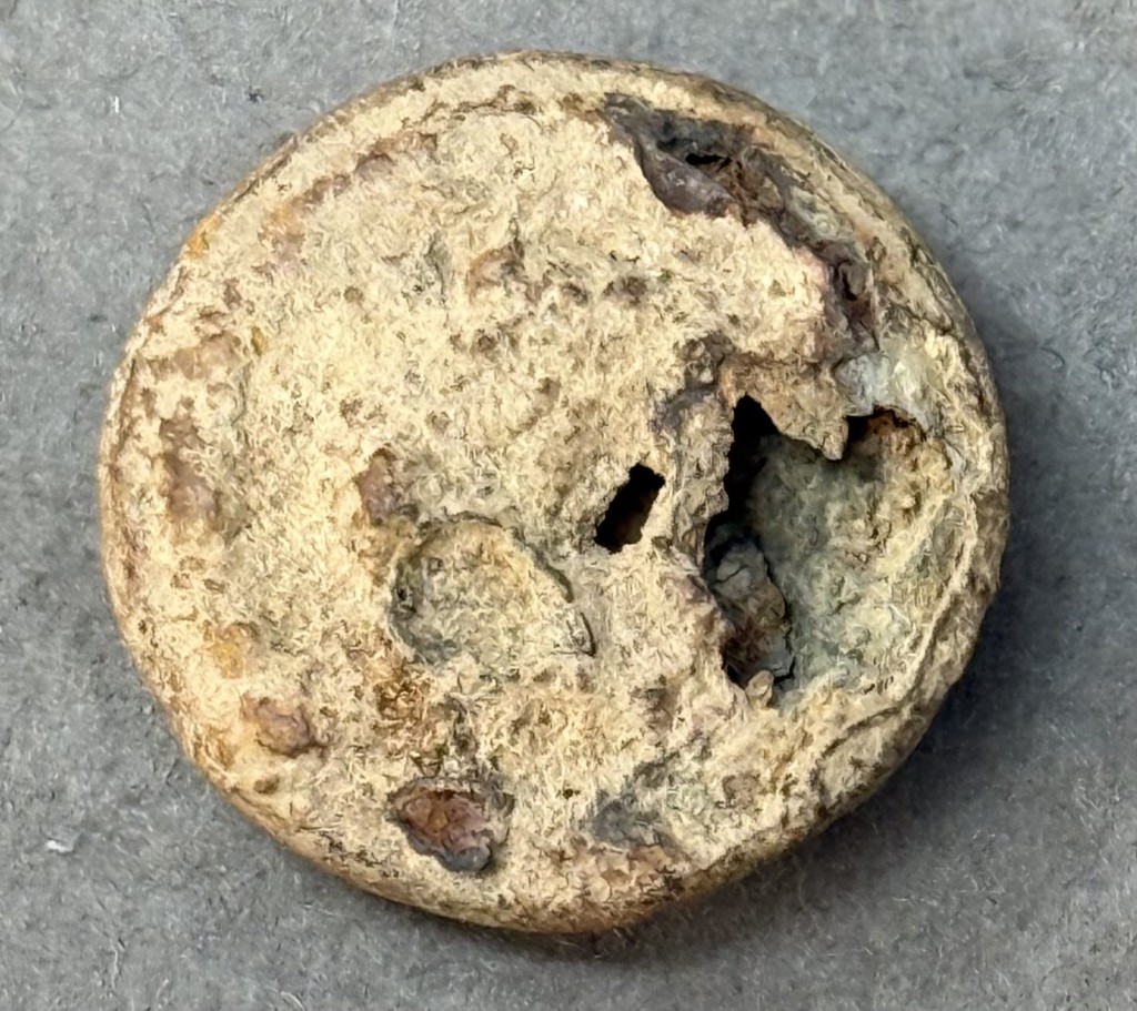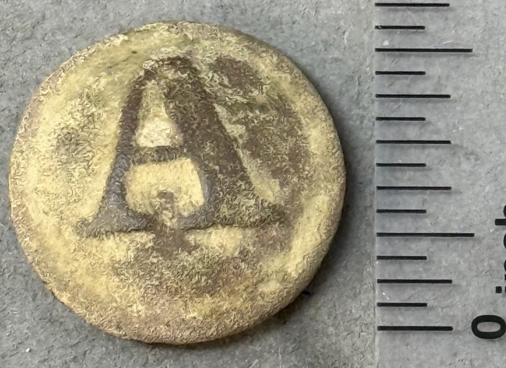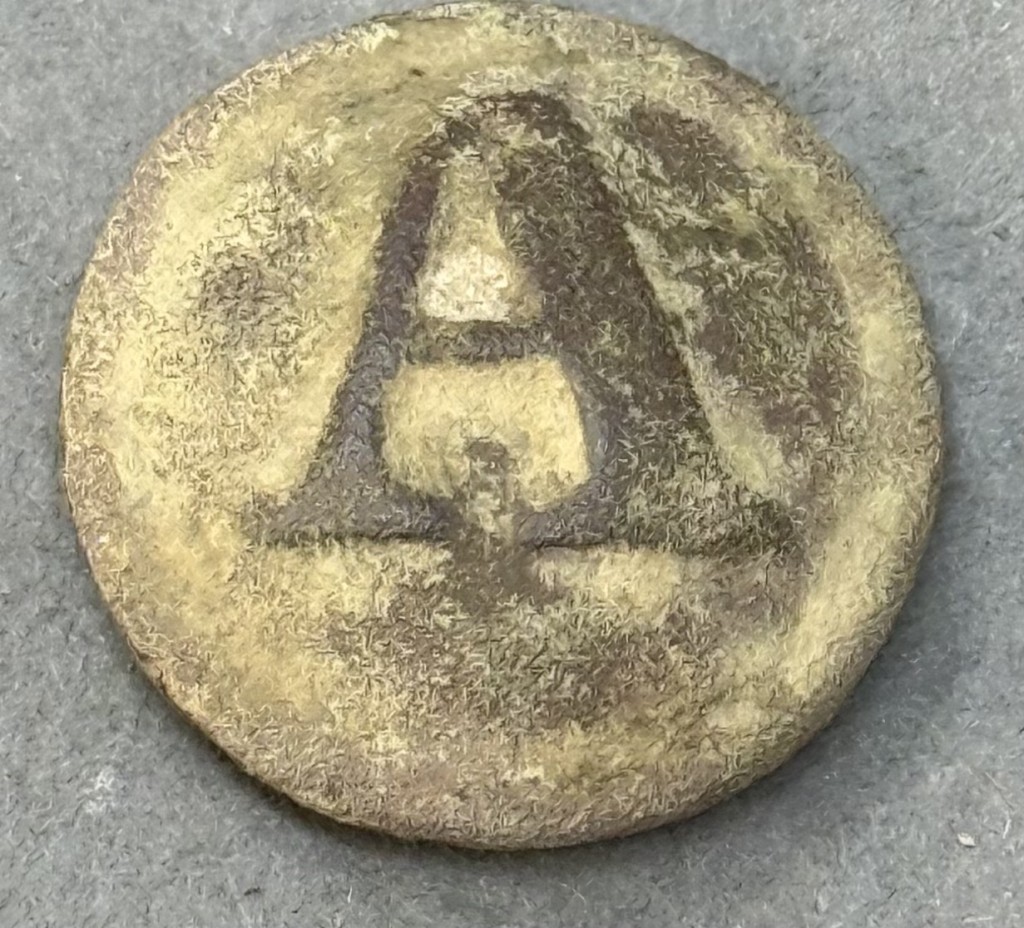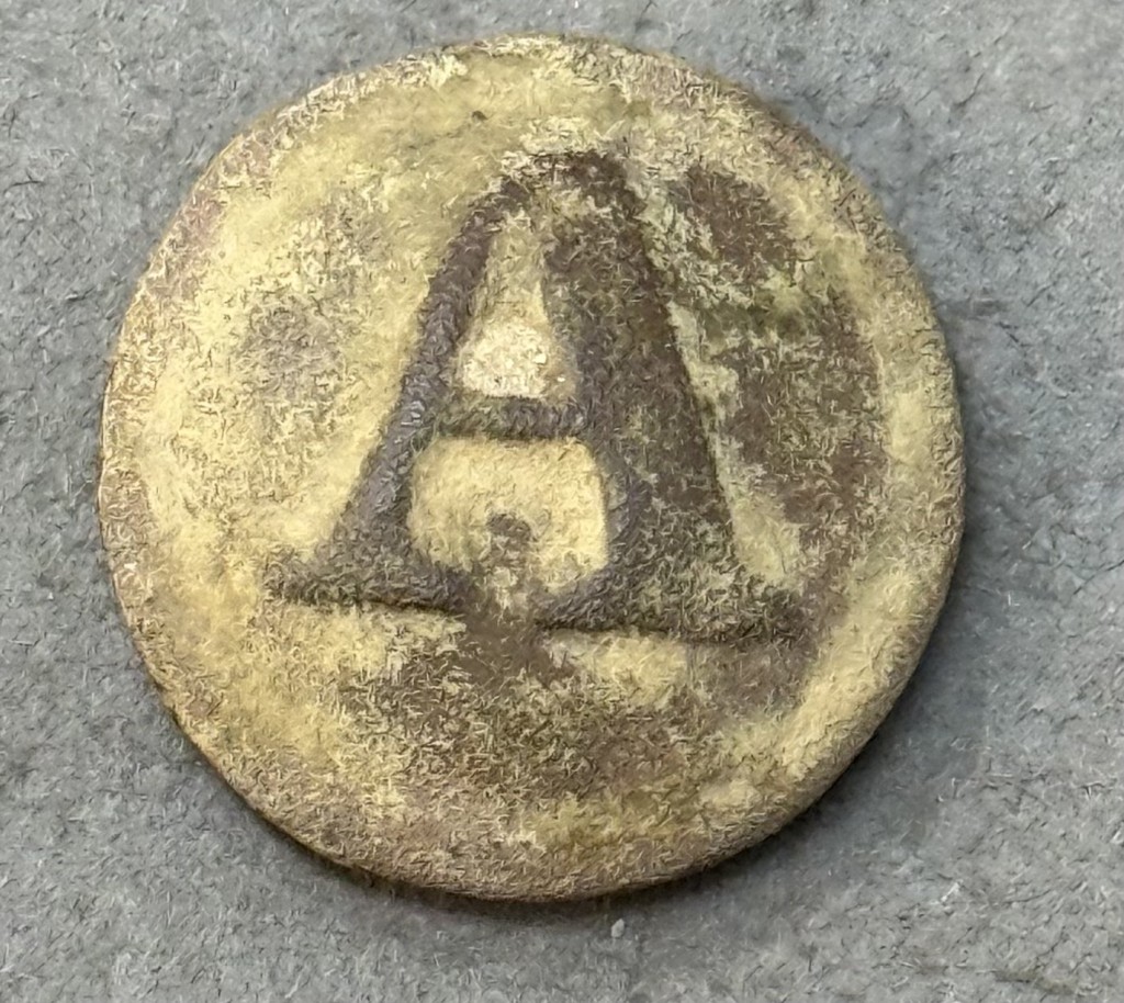 Confederate Block A (Artillery) Coat Size Button Recovered At Cold Harbor, Virginia Certified. A very nice earlier dug relic from the Culpeper battlefield found on what was then private property. It has a rare tin back (local backmark) That is oxidized (see photos). An excellent Confederate Artillery Button. A good condition button for A dug example. A fantastic button excavated many years ago on the historic Culpeper battlefield on what was then private property. A very nice button from a very historic battlefield. 100% guaranteed to be authentic Gettysburg Museum certified, Museum COA provided. Don’t miss this! It has been a while since we had a Confederate A button! They are getting very tough to find!