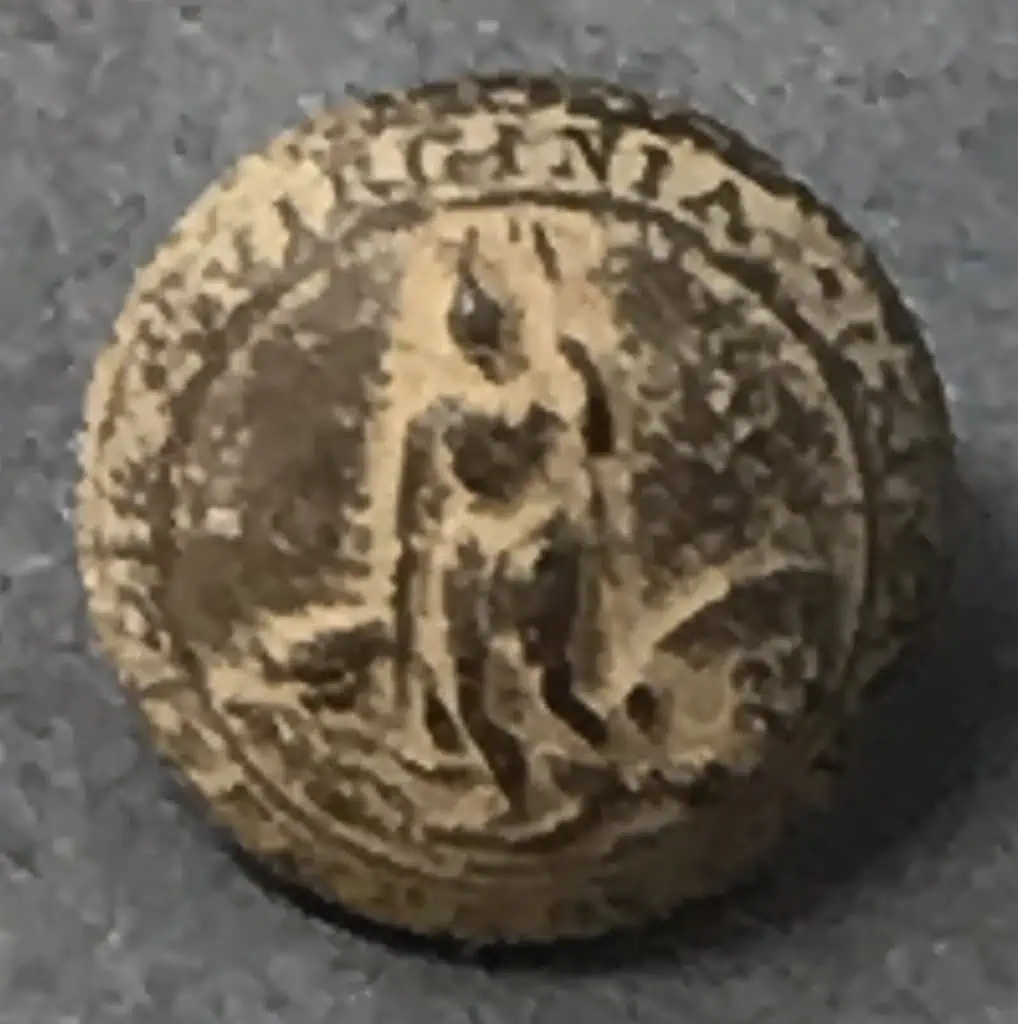 Original Confederate Virginia Cuff Size Button With Backmark Recovered At Fredericksburg, Virginia Certified.  A very nice earlier dug relic from the battlefield found on what was then private property. It is very solid and has a back mark.  The shank is complete. An excellent Confederate State Button. An amazing condition button for A dug example. A fantastic button excavated many years ago on the historic Fredericksburg battlefield on what was then private property. A very nice button from a very historic battlefield. 100% guaranteed to be authentic Gettysburg Museum certified, museum COA provided. Don’t miss this! It has been a while since we had a cuff State Virginia button! They are getting very tough to find!