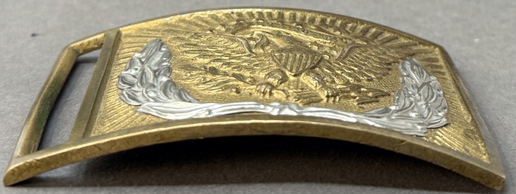Original Civil War Union NCO/Enlisted Eagle Sword Belt Plate Non-Excavated Certified By The Gettysburg Museum Of History. These plates were adopted in 1851 and were the standard sword belt plate. these rectangular plates were cast with the “arms of the U.S.” eagle with spread wings bearing a U.S. shield on its chest, clutching arrows and olive branch, and holding a ribbon reading, “E Pluribus Unum in its beak. Underneath is a wreath in silver and overhead is a band of stars with a cloud behind and rays of the sun above. The wreaths and stars were often given a thin silver wash that seldom survives, and many collectors assume these are issue enlisted men’s plates, which are in fact those with the less detailed die work and inexpensive, but resilient, nickel silver applied wreaths. Officers purchased their own equipment, almost always through private military goods dealers, and the quality varied. In this case, the plate shows a very nice, stippled background as well as excellent detail to the eagle motif. Very good outstanding condition. Sword plate buckles this nice are very difficult to find and only come from old collections. 100% guaranteed to be authentic Gettysburg Museum certified, museum COA provided. Also note when browsing our web site there are several pages of items, at the bottom of the list look for other page numbers. Scarce! An OUTSTANDING Sword belt plate. DO NOT MISS THIS! If you want the BEST This IS IT!