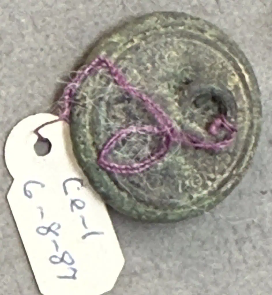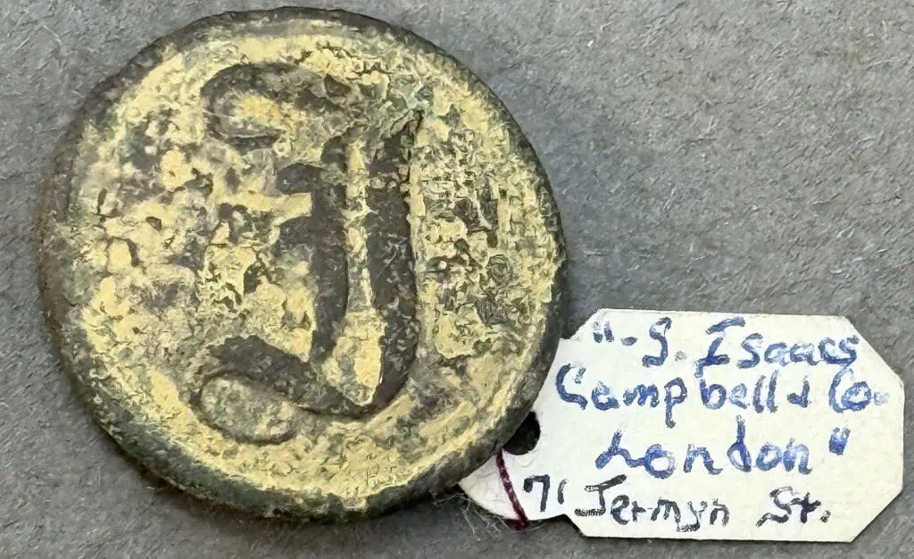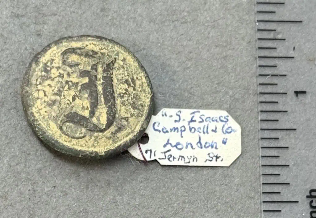 Confederate Script I (Infantry) Coat Size Button Recovered At Caroline County, Virginia. A very nice earlier dug relic from the battlefield found on what was then private property. The shank is still intact but bent. An excellent Confederate Infantry Button. An amazing condition button for a dug example. A fantastic button excavated many years ago on the historic Caroline County (near Richmond) battlefield on what was then private property. A very nice button from a very historic battlefield. 100% guaranteed to be authentic Gettysburg Museum certified, museum COA provided. Don’t miss this! It has been a while since we had a Confederate script I button! With original digger tag They are getting very tough to find!
