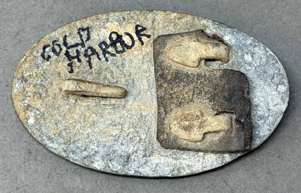 Original Nice Civil War Excavated Relic U.S. Belt Plate (Buckle) Recovered At The Cold Harbor In Virginia great dug plate For the collector who wants an authentic battlefield ground dug relic. A very nice smooth brown patina. A solid plate from a very historical battlefield. This is an older recovered belt plate. A very historic recovery location and a very nice looking plate. Belt buckles are 4x more rare than cartridge box plates. When we went through old collections like this there are about 3 box plates for every 1 belt plate! Recovered what was then off National Park property and is 100% Legal and 100% authentic. All of the 3 of the arrow style hooks are present and it looks great, in relic condition. Looks like the digger stabilized the edge with glue it out Still looks good! Still has RARE LEATHER REMNANT!! This is one of the better early pick-up belt plates from an old collection. U.S. plates this nice are very difficult to find and only come from old collections. Battlefield recovered plates with recovery history are getting very hard to find. 100% guaranteed to be authentic Gettysburg Museum certified, museum COA provided. Also note when browsing our web site there are several pages of items, at the bottom of the list look for other page numbers. Scarce location! Don’t miss this. Nice EARLY PICK-UP.