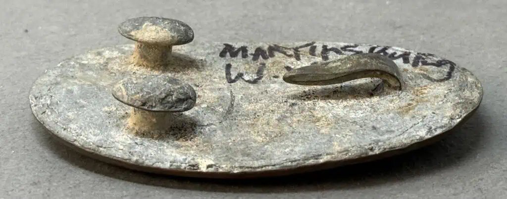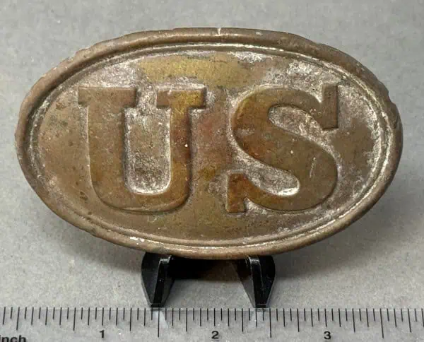 Authentic Civil War Excavated Relic U.S. Belt Plate Recovered on the Martinsburg battlefield in West Virginia. A great dug plate For the collector who wants an authentic battlefield ground dug relic. A very nice brassy brown patina. A solid plate from a very historical battlefield. This is an older recovered plate. A very historic recovery location and a very nice looking plate. Recovered what was then off National Park property and is 100% Legal and 100% authentic. All of the hooks are intact (see photos) it’s solid and it looks great, in excellent relic condition! This is one of the better early pick-up plates from an old collection. Belt buckles are 4x more rare than cartridge box plates. When we went through old collections like this there are about 3 box plates for every 1 belt plate. Early “puppy paw” style buckles are even more RARE! US plates this nice are very difficult to find and only come from old collections. Battlefield recovered plates with recovery history are getting very hard to find. 100% guaranteed to be authentic Gettysburg Museum certified, museum COA provided. Also note when browsing our web site there are several pages of items, at the bottom of the list look for other page numbers. Scarce location! Don’t miss this. Has a very “been there” combat used face and the back is very nice for a relic. One of the best! Antietam campaign.