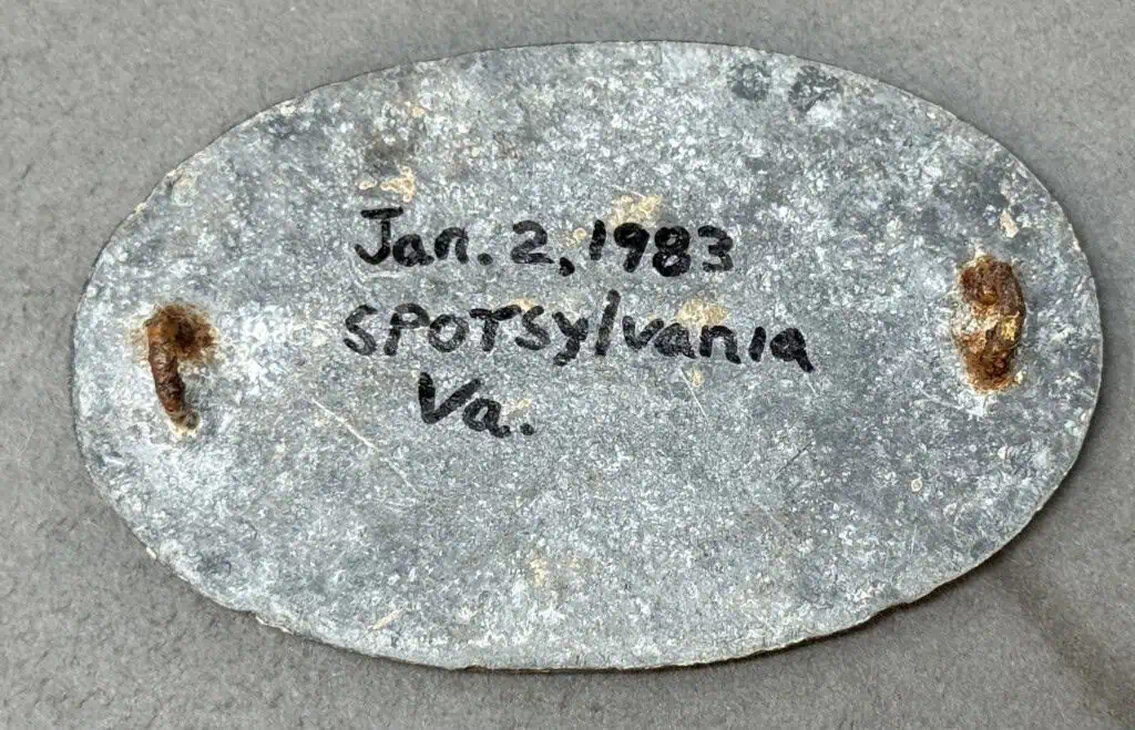Authentic Civil War Excavated Relic U.S. Box Plate Recovered on the Spotsylvania battlefield in Virginia. A great dug plate For the collector who wants an authentic battlefield ground dug relic. A very nice smooth chocolate brown patina. A solid plate from a very historical battlefield. This is an older recovered plate. A very historic recovery location and a very nice looking plate. Recovered what was then off National Park property and is 100% Legal and 100% authentic Both of the two hooks are intact and it looks great, in excellent relic condition. This is one of the better early pick-up box plates from an old collection. US plates this nice are very difficult to find and only come from old collections. This has an old digger notation on the back! Battlefield recovered plates with recovery history are getting very hard to find. 100% guaranteed to be authentic Gettysburg Museum certified, museum COA provided. Also note when browsing our web site there are several pages of items, at the bottom of the list look for other page numbers. Scarce location! Don’t miss this. Excellent location! IF YOU WANT THE BEST THIS IS IT!