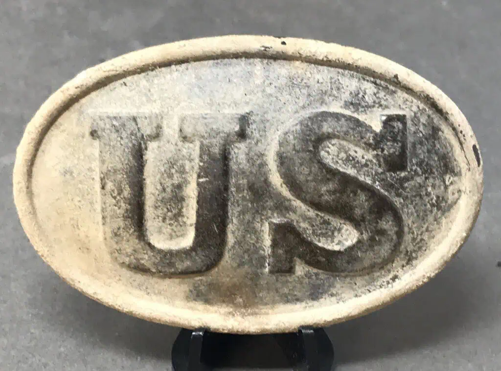 Authentic Civil War Excavated Relic U.S. Box Plate Recovered on the Aldie Battlefield in Virginia. A great dug plate For the collector who wants an authentic battlefield ground dug relic. A very nice green and slightly light brown patina. A solid plate from a very historical battlefield. This is an older recovered U.S. box plate. A very historic recovery location and a very nice looking plate. Recovered at The Aldie Battlefield , Recovered Pre-National Park and is 100% Legal and 100% authentic. Both of the two hooks is broken and it looks great, in excellent relic condition. This is one of the better early pick-up box plates from an old collection. US plates this nice are very difficult to find and only come from old collections. Battlefield recovered plates with recovery history are getting very hard to find. 100% guaranteed to be authentic Gettysburg Museum certified, museum COA provided. Also note when browsing our web site there are several pages of items, at the bottom of the list look for other page numbers. Scarce! An outstanding US plate. Great History OUTSTANDING DON’T MISS THIS ONE!