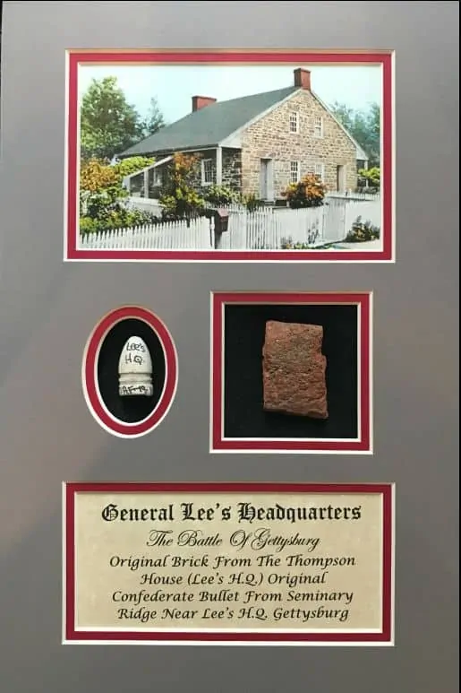 Authentic brick piece from the world famous Thompson House better known as General Lee’s Headquarters with a Confederate Civil War bullet recovered near the house (Seminary Ridge) Gettysburg battlefield. Matted and framed with a Riker frame. Mat color may vary. This relic is certified by The Gettysburg Museum of History. The bullet was recovered before Gettysburg was a National Park and is 100% legal to own. Museum documentation included. Certified by The Gettysburg Museum of History. The brick comes from the original chimney and was obtained by us from the former owners of the property. An amazing historic relic from one of Gettysburg’s most iconic spots. The bullet in this display was found on Seminary Ridge (near Lee’s Headquarters) . The Thompson house is on Seminary Ridge. Very limited supply. Framed in a collector’s glass case (Riker Case) with museum mat and art. The frame is 8″/12″ a great size and perfect gift. All Gettysburg relics were recovered before it was National Park and are 100% legal to own. 100% Guaranteed the be Authentic, Comes with Gettysburg Museum documentation (COA) Certificate Of Authenticity . Very limited. Please see our other Gettysburg battlefield collectors sets available on our web site. The perfect gift for the serious Gettysburg enthusiast.