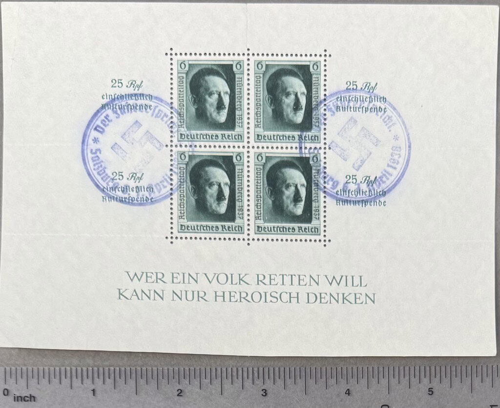 A Very Nice Adolf Hitler Block Plate Third Reich Era Stamps Stamped For Hitler Birthday Salzburg Certified. A Very Nice Collection Of German Third Reich Era Stamps in block plate form. postmarked several times on Hitler’s Birthday. original stamps of “Hitler Heads” Third Reich Nazi stamps. OUTSTANDING collection! Complete museum documentation (COA) Provided. Certified by The Gettysburg Museum of History. 100% guaranteed to be authentic. The Gettysburg Museum of History does not support or condone Adolf Hitler or the Nazi Party and is only offering this as a historic relic. Please see our other items. Also note when browsing our web site there are several pages of items, at the bottom of the list look for other page numbers. Hitler Stamps are desirable To Collectors And Historians! DO NOT MISS THIS!