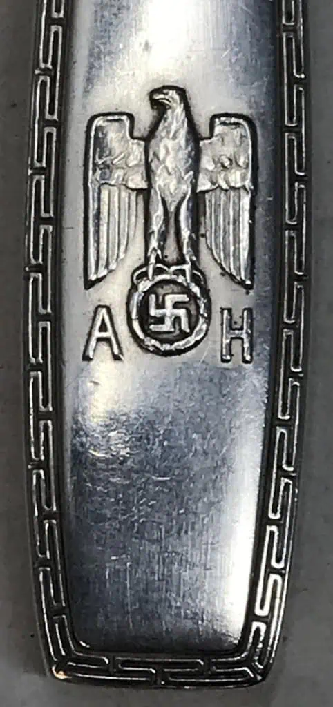 Adolf Hitler’s Personal Formal Pattern Silver Knife Captured By A U.S. Soldier. An EXTRA Large silver knife with Adolf Hitler’s personal eagle and “AH” monogram with “Greek Key” edge pattern. Used for formal lunches and dinners at The Eagle’s Nest, the Berghof, and the Reich Chancellery. This is the pattern Hitler used for formal state dinners. This pattern was also found at the Brown House in Munich. This piece has all the proper hallmarks (see photos) made of .800 silver. Nice big 10.10″ piece! CONSIDERED A SWERVING KNIFE (RARE) Excellent condition except for a few small scratches like all silver does (see photos). 100% guaranteed to be authentic complete museum documentation (COA) provided. Offering for one formal Hitler knife as pictured. An amazing historical artifact from the 20th century’s most infamous person. Hitler items always sell very fast when we get them. Don’t miss your chance to own a real museum authenticated Hitler piece with provenance. The formal pattern is the most ornate and desirable pattern of all the Hitler silver and they are getting very difficult for us to find. Hitler personal items are a great investment item and the prices keep going up and investment potential endless. See our other pieces on our web site. Outstanding VERY BIG piece! DON’T MISS THIS! HITLER’S SILVER IS ALMOST IMPOSSIBLE TO FIND NOW! GET IT WHILE YOU CAN! Knives are some of the most desirable pieces! THIS BEING A SERVING KNIFE IT’s THE LARGEST IN THE SET! ALMOST PERFECT CONDTION!