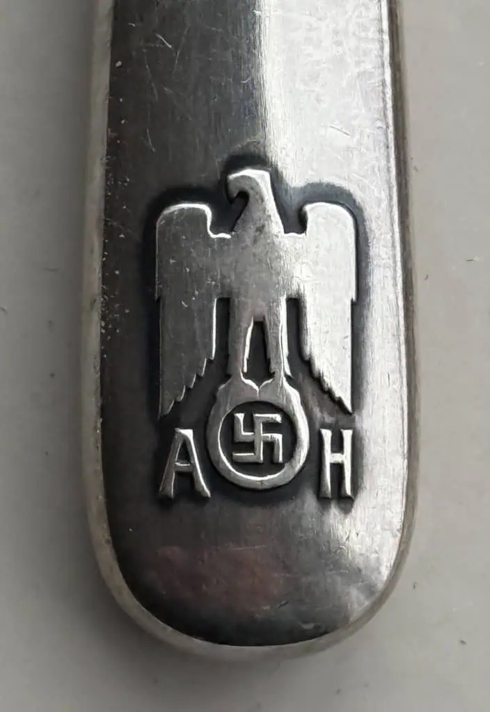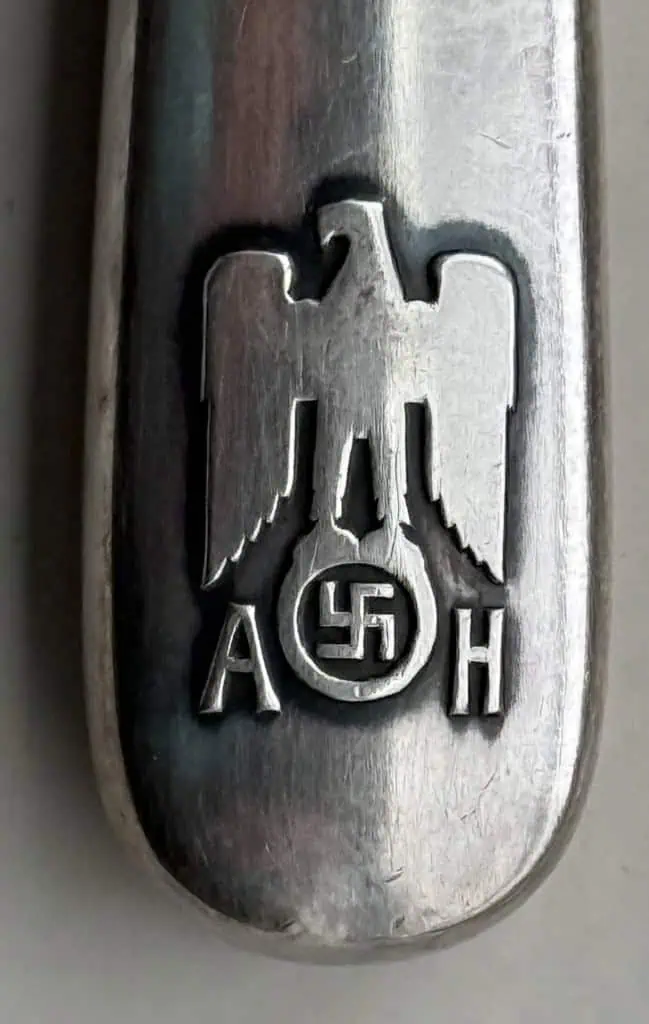 Adolf Hitler’s Personal Silver KNIFE Apartment Informal Pattern Brought Home By A U.S. Veteran Certified By The Gettysburg Museum Of History. A silver butter knife with Adolf Hitler’s personal eagle and “AH” monogram used for informal lunches and dinners at his apartment in Munich. This is the pattern Hitler used personally on an almost daily basis. This pattern was also found at the Fuhrerbau apartment in Munich. This piece has all the proper hallmarks (see photos) made of .800 solid silver. 6.25″ inches long (nice piece). Does have a few very small scratches and marks from use . Brought home by a U.S. Veteran as a trophy of war. 100% guaranteed to be authentic complete museum documentation (COA) provided. Offering for one informal Hitler fork as pictured. An amazing historical artifact from the 20th century’s most infamous person. Hitler items always sell very fast when we get them. Don’t miss your chance to own a real authenticated Hitler piece with Museum provenance. If you ever wanted a Hitler item that he most likely used this is as good as it gets. Hitler personal items are a great investment item, and the prices keep going up and investment potential endless. See our other pieces on our web site. Knives are some of the most desirable pieces!