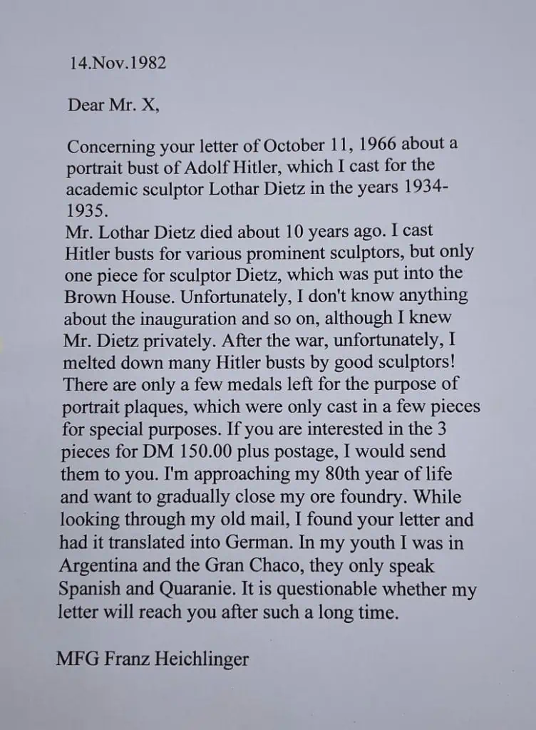 AMAZING 2.5x Life-size Adolf Hitler Bronze Bust Commissioned for ‘The Brown House’ by Lothar Dietz The ultimate Hitler bust! Not only is this bronze bust of Hitler the largest we’ve seen in private hands, it was specifically cast for display in ‘The Brown House’. The Brown House (German: Braunes Haus) was the name given to the Munich mansion located between the Karolinenplatz and Königsplatz, known before as the Palais Barlow, which was purchased in 1930 for the Nazis. They converted the structure into the headquarters of the National Socialist German Workers’ Party (Nationalsozialistische Deutsche Arbeiterpartei; NSDAP). Its name comes from early Nazi Party uniforms, which were brown. Many leading Nazis, including Adolf Hitler, maintained offices there throughout the party’s existence. It was destroyed by Allied bombing raids during World War Il. The bust comes with a letter dated November 1982 from the longtime owner of the foundry and states that he only cast one Hitler bust for Lothar Dietz and it was a special order for the Brown House in the 1930’s. The letter to “X” we assume is the U.S. Veteran who brought it home but we don’t know his name. We assume he must have in the 42nd or 45th Divisions since they were first into Munich in 1945. The Brown House was bombed but not completely destroyed and many items were found in the basement. We place a visor cap on the head of the bust for a size comparison. This is the best and most historically important Adolf Hitler bust we have seen. MASSIVE 22″ high with base VERY HEAVY 62 pounds! ! A very nice looking artifact. In very good condition. Nice used example showing the expected but mild storage age and wear . 100% Guaranteed to be authentic. Complete museum documentation (COA) Provided. Certified by The Gettysburg Museum of History. The Gettysburg Museum of History does not support or condone Adolf Hitler or the Nazi Party and is only offering this as a historic relic. Please see our other items. Also note when browsing our web site there are several pages of items, at the bottom of the list look for other page numbers. Nice Example! Don’t Miss It! When size matters! A striking piece and an excellent likeness of Hitler! DO NOT MISS THIS ONE! IF YOU WANTED THE BEST THIS IS THE BEST!