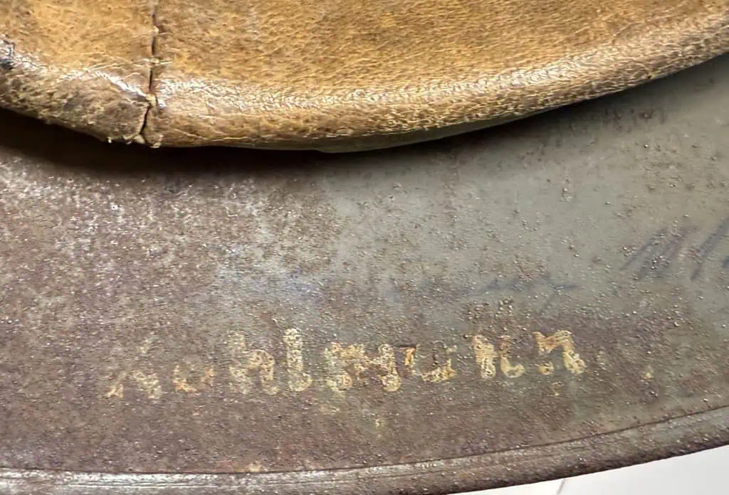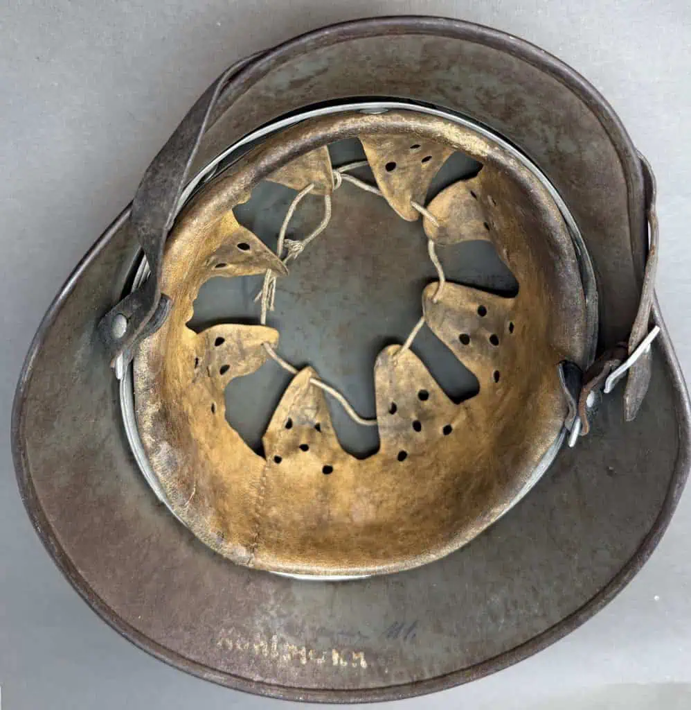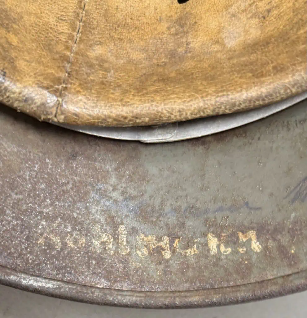 Amazing Original WWII German M-35 Normandy Camo Ex Single Decal Helmet Brought Home By A U.S. Veteran Certified By The Gettysburg Museum Of History. The helmet retains about 75% of its field-applied, Normandy type camouflage paint in shade of green-tans, with spots of the original gray green paint just visible and some wear to the base metal. With some “wood chip” texture in the paint. The outline decal is just partially visible beneath the camouflage paint. The national tri-color shield decal is painted over and is visible with traces of the Army Eagle decal beneath the camouflage paint. All three liner retaining rivets and both inserted ventilation bushings are intact. The age and usage darkened tan M31 leather liner shows chafe wear to the edges and has numerous light surface wear. It looks stiff but it is very soft and flexible and all the fingers are intact. The reverse interior neck guard apron serial/lot number, The interior left side apron has stamped manufacturers code and size, “ET64”, indicating manufacture by Eisen-und Hüttenwerke, AG Thale/Harz, factory. , size 64. It has the original soldier’s name inside the liner (see photos). This helmet is what collectors call a “One Looker” meaning it needs no scrutiny or closer looks to establish it’s authenticity. Authentic Normandy camouflage German helmets are EXTREMELY desirable and the value’s keep going up! An outstanding WWII U.S. Veteran bring back helmet. Good combat worn condition with typical wear and storage age and expected issues. 100% Guaranteed to be authentic Complete museum documentation (COA) Provided. Certified by The Gettysburg Museum of History. Please see our other items. Also note when browsing our web site there are several pages of items, at the bottom of the list look for other page numbers. If you like good combat used bring backs this is a great example! Do Not Miss This One! Excellent Early helmet. INVESTMENT QUALITY!