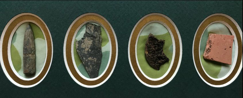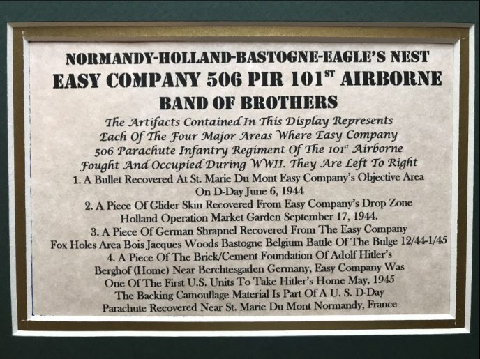 Deluxe Easy Company WWII Relic Collection Our Best Band Of Brothers Related Set. This deluxe collectors box 8/12″ matted in glass case is our best “Band Of Brothers”set. It has an authentic relic from the 4 major areas “Easy Company” fought. It has a bullet recovered at St. Marie Du Mont in Normandy France where they fought on D-Day. A glider piece from their drop zone during the Market Garden campaign (Holland). A piece of German shrapnel fired at the Americans recovered in the Bois Jacques (Jacks Woods), where Easy Company fought during the battle of the bulge. The last relic is a piece of the original foundation from Adolf Hitler’s Berghof (his house), Easy Company was one of the first US units into the Bertesgaden area and the infamous Eagles Nest. The 4 relics have a piece of U.S. WWII camouflage parachute in the background. You receive 5 authentic WWII Easy Company related artifacts in this deluxe collector’s matted glass case. This is the ultimate gift for the fan of Band Of Brothers, Major Winters, and Easy Company. This relic is certified by The Gettysburg Museum of History. Museum documentation (COA) Certificate Of Authenticity included . Very limited. Very rare, relics from these areas are no longer obtainable, our came from old Museum collections in Europe. Please see our other WWII collectors sets available on our web site. The perfect gift for the serious Band Of Brothers enthusiast.Nice size for collectors 8/12″. Very limited supply! Order soon these will not last. Also note when browsing our web site there are several pages of items, at the bottom of the list look for other page numbers.