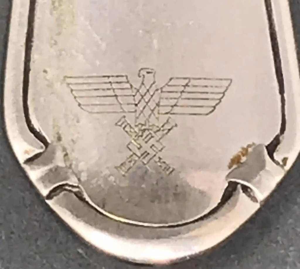 Herman Goering’s Personal Silver Fork”Wedding Pattern” Taken By A U.S. Army Solider Certified. Herman Goering’s Personal “Reich Marshall” Monogram cake fork sometimes called a fish fork Taken By A U.S. Soldier From His Train Car or home. Adolf Hitler’s Number 2 man. A silver fork with fancy roll stamped swastika, eagle and crossed Reich Marshal or Field Marshall baton design. This fork has all the correct hallmarks. Goering was the number 2 person in the Third Reich and was know for fancy extravagant wealth. Collectors and Veteran’s have called this set “The Wedding Set” because it was either used or was a gift for his wedding. He was the top Nazi next to Hitler and was tried and convicted at the Nuremberg trials. After his his conviction he cheated the hangman by taking poison. This spoon was taken by a U.S. Soldier during WWII as “Loot” or “Trophy of War”. This Goering silver pattern was found in his personal train and home at Berchtesgaden, Germany in May of 1945. It is shown the Dr. Mark Griffith book of WWII silver and he and interviewed hundreds of Veterans pictured here. 100% guaranteed to be authentic complete museum documentation (COA) provided. An amazing historical artifact from the 20th century’s most infamous bands of characters. We have just a few pieces of silver and it always sells very fast when we get it. Don’t miss your chance to own a real museum authenticated piece with U.S. Veteran provenance. Please see our other Goering silver on the web site. Third Reich silver is a great investment item and the prices keep going up and with real historically accurate U.S. Veteran provenance makes this a rare and desirable piece. The Goering “Wedding Pattern” Is the most desirable pattern, Very RARE! Nice piece!