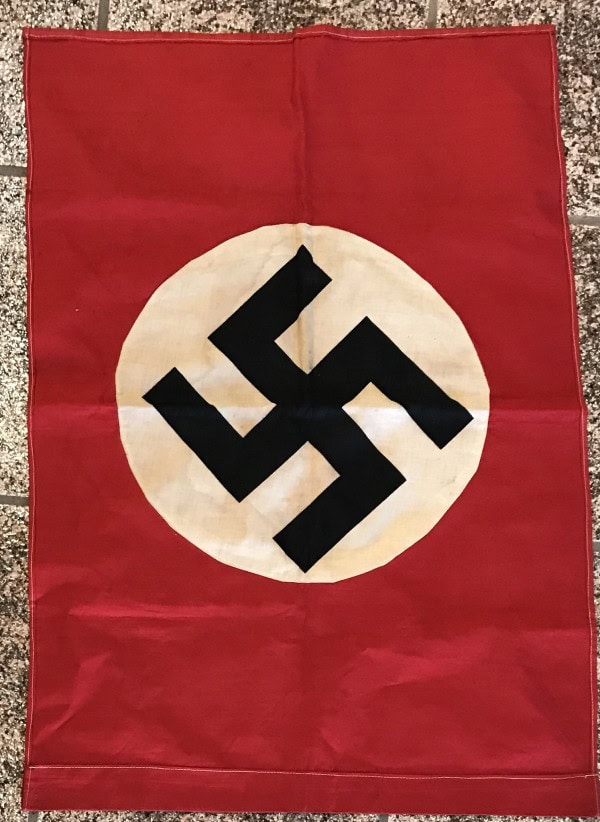Original WWII Era German Nazi Party Flag Certified. A standard style Cloth banner type flag. Utilized by pretty much by all the organization of the Third Reich in one form or another. The swastika, (a Sanskrit word meaning “well being”), is an ancient symbol that was utilized in numerous diverse cultures and signified both the cycle of life and the sun. The swastika was also a Nordic rune and the pagan Germanic symbol for Thor, God of Adventurers. In good condition single sided 20″/28! standard cotton bunting style material with screened swastika and disk. A fantastic piece of WWII history good condition with storage wear, no fading (see photos) This flag is A good quality version and one of the better displayable sizes for the most discriminating and cultivated collector. Even with the minor condition issues it Overall a very collectible flag with lots of history Nice period used flag captured by a U.S. Veteran and brought home as a war trophy. Nice used example showing the expected age . 100% Guaranteed to be authentic Brought home by a solider as a trophy of war. A very desirable size in good condition an outstanding example. Don’t miss this one! RARE in this size. Complete museum documentation (COA) Provided. Certified by The Gettysburg Museum of History. The Gettysburg Museum of History does not support or condone Adolf Hitler or the Nazi Party and is only offering this as a historic relic. Please see our other items. Also note when browsing our web site there are several pages of items, at the bottom of the list look for other page numbers. RARE IN THIS SIZE. Good EXAMPLE! NSDAP FLAGS ARE GETTING TOUGHER TO FIND! Don’t Miss It!!!! RARE, Good used but used Condition!