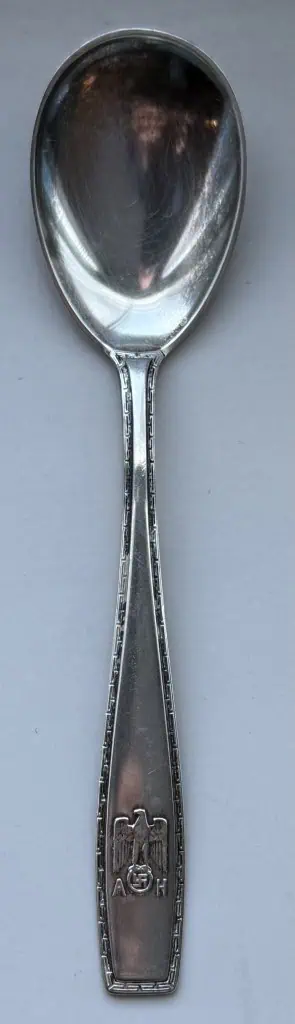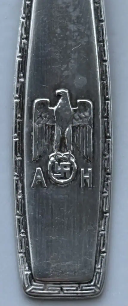 Adolf Hitler’s Personal Formal Pattern Silver Spoon Captured   By A U.S. Soldier.  A silver tea spoon   with Adolf Hitler’s personal eagle and “AH” monogram with “Greek Key” edge pattern. Used for formal lunches and dinners at The Eagle’s Nest, the Berghof, and the Reich Chancellery. This is the pattern Hitler used for formal state dinners. This pattern was also found at the Brown House in Munich. This spoon has all the proper hallmarks (see photos) made of .800  silver.  Good condition (see photos).  About 6.25″   100% guaranteed to be authentic complete museum documentation (COA) provided. Offering for one formal Hitler spoon as pictured. An amazing historical artifact from the 20th century’s most infamous person.   Hitler items always sell very fast when we get them. Don’t miss your chance to own a real museum authenticated Hitler piece. The formal pattern is the most ornate and desirable pattern of all the Hitler silver and they are getting very difficult for us to find. Hitler personal items are a great investment item and the prices keep going up and investment potential endless.   See our other pieces on our web site. Outstanding piece! DON’T MISS THIS! HITLER’S SILVER IS ALMOST IMPOSSIBLE TO FIND NOW! GET IT WHILE YOU CAN!