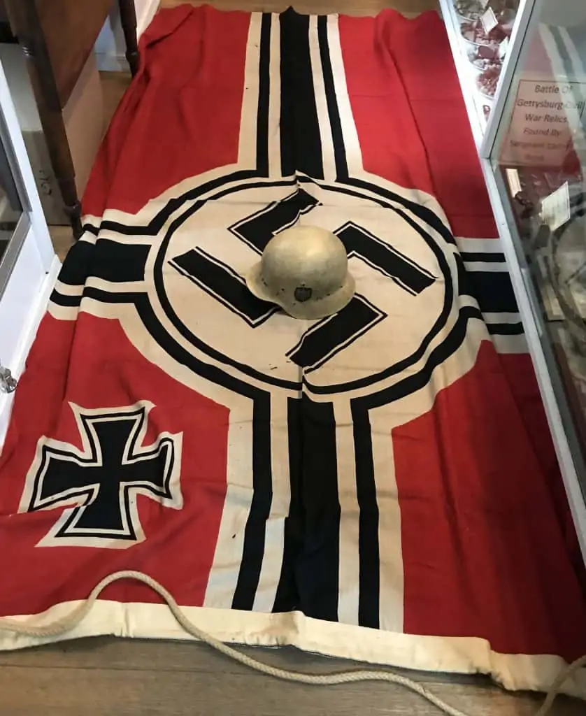 ORIGINAL LARGE WWII German NSDAP (NAZI) NATIONAL WAR FLAG. (Reichskriegsflagge) Brought Home By A U.S. Veteran Certified. The national war flag was flown on all Kriegsmarine, (Navy), warships, Luftwaffe, (Air Force), airfields and all buildings owned by the Wehrmacht, (Armed Forces). The flag was also to be hoisted daily at all occupied barracks and was also utilized at victory parades and special events along with the standard national swastika flag. This example is the second pattern War Flag, circa 1937/38-1945. single piece, dual sided, printed wool/linen construction national war flag. The flag features a red base field with a central white/black/white/black bordered white disk with a black and white bordered black canted swastika to the center. The flag has black, vertical and horizontal bars emanating from the central disk with white/black/white borders. The canton features a white/black/white bordered black Iron Cross. The hoist edge has a small, dual-ply, reinforcement panel to each corner. The hoist edge is trimmed in white, tunnel looped, cotton/wool blend bunting with the COMPLETE suspension rope and loop! Nicely maker marked, size marked “1.5/2.5″ 150/250 (centimeters) (60″/99”) and (Reichskriegsflg) marked. Nice used example very clean excellent CONDITION except for a few tiny moth nips (see photo). We placed a helmet on the flag for size reference. A fantastic piece of history . This flag is A good quality version and one of the better display sizes for the most discriminating and cultivated collector. a very collectible flag with lots of history Nice period used flag captured by a U.S. Veteran and brought home as a war trophy. 100% Guaranteed to be authentic Brought home by a solider as a trophy of war. A very desirable displayable size . Don’t miss this one! RARE in this size. Complete museum documentation (COA) Provided. Certified by The Gettysburg Museum of History. The Gettysburg Museum of History does not support or condone Adolf Hitler or the Nazi Party and is only offering this as a historic relic. Please see our other items. Also note when browsing our web site there are several pages of items, at the bottom of the list look for other page numbers. Don’t miss it! OUTSTANDING EXAMPLE KREIGS FLAGS ARE GETTING TOUGHER TO FIND!!!! In Very Nice Condition Very clean, And A Very RARE maker! Don’t Miss This one! !