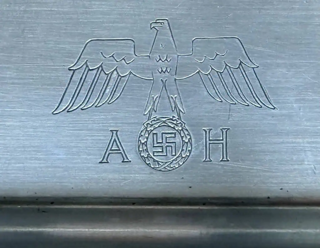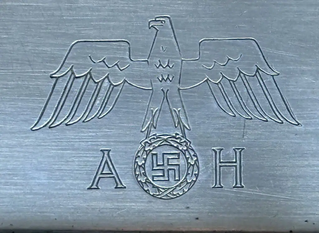 Original Hitler silver Large SQUARE Tray Serving piece from his “formal” dinning set. We have a few pieces we are selling. This offer is for one piece a mega rare tray TEA server. This is one of the rarest and BEST pieces from the set. This was what the Tea Pot and Coffee Pot and creamer and sugar bowl would come out on! The sets would have up to 30 forks and spoons for settings but only a few trays. The formal pattern is the most desirable of all the silver owned by Hitler featuring his personal eagle and AH monogram with Hitler’s personal eagle. It has the proper silver hallmarks No dents or dings just a few very light barley noticeable scratches like all silver has. This was “liberated” (looted) by a U.S. soldier at the end of WWII. This Hitler silver was taken by a U.S. Solider The 101st Airborne Division and The 3rd Division was among the first U.S. unit to arrive at the Obersalzberg area and enter Hitler’s home as well as The Eagles’s Nest. This is the piece you will receive. The formal serving pieces are the most desirable pieces of Hitler silver. 100% guaranteed to be authentic complete museum documentation (COA) provided. An amazing historical artifact from the 20th century’s most infamous person. Hitler formal silver always sells very fast when we get them. Don’t miss your chance to own a real museum authenticated piece with U.S. Veteran provenance. Hitler formal silver is a great investment item and the prices keep going up and with real historically accurate U.S. Veteran provenance making the investment potential endless. Serving pieces rarely are offered and are extremely rare. See our other AH pieces too. Also note when browsing our web site there are several pages of items, at the bottom of the list look for other page numbers! DO NOT MISS THIS! If you have a Hitler tea pot or coffee pot or sugar bowl or creamer you NEED THIS! MEGA RARE! Offering is for the square tea tray only! Coffee Pots and other items are show for display. THE ONE YOU HAVE BEEN WAITING FOR! For a video see