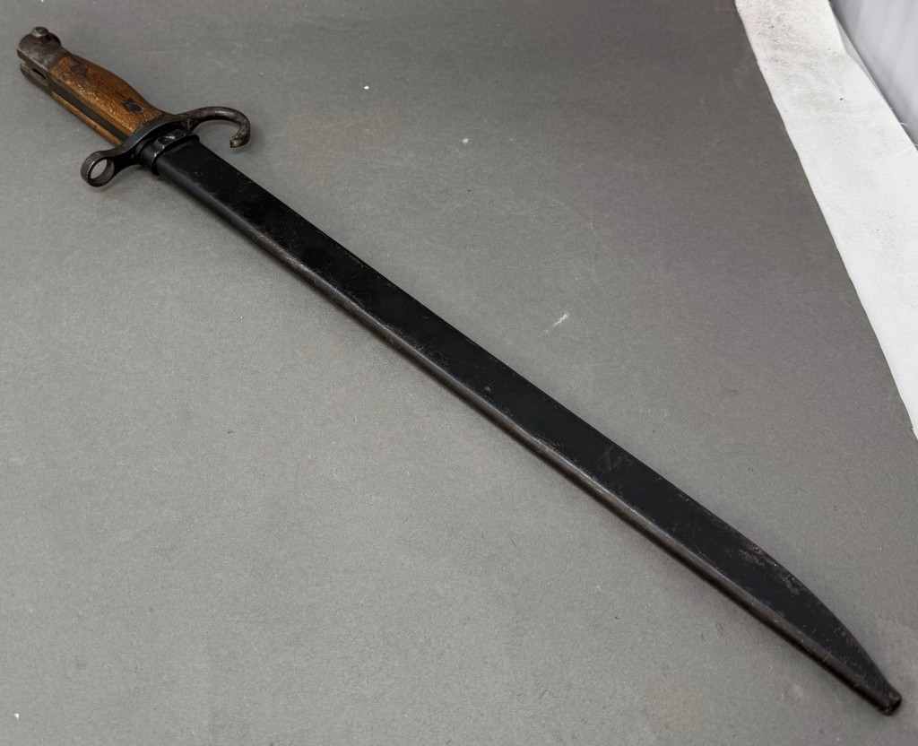 Nice Original WWII Japanese Type 30 Bayonet Brought Home By A U.S. Veteran. Japanese Type 30 bayonet and scabbard. Serial numbers and manufacturer’s stamps are evident to the head of the blued, flat-sided bird’s head pommel with a button release. The lightly age-darkened, contoured wraparound wooden grips are fixed with two rivets. The blued, hooked contoured metal crossguard has a circular muzzle guide. The 40cm fullered bright blade.. The first pattern sheet metal scabbard, with a ball tip and with a rounded strap band,. Has a few small nicks in the clueing (see photos). Nice example blade is good combat used condition! 100% Guaranteed to be authentic and is certified by The Gettysburg Museum Of History and comes with our Museum COA (certificate of authenticity). A rare piece of WWII history. DO NOT MISS THIS!