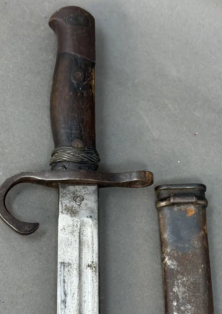 Nice Original WWII Japanese Type 30 Bayonet With Added Knot Brought Home By A U.S. Veteran. Japanese Type 30 bayonet and scabbard. Serial numbers and manufacturer’s stamps are evident to the head of the blued, flat-sided bird’s head pommel with a button release. The lightly age-darkened, contoured wraparound wooden grips are fixed with two rivets. The blued, hooked contoured metal crossguard has a circular muzzle guide. The 40cm fullered bright blade.. The first pattern sheet metal scabbard, with a ball tip and with a rounded strap band,. Has a few small nicks in the clueing (see photos). Nice example blade is good combat used condition! 100% Guaranteed to be authentic and is certified by The Gettysburg Museum Of History and comes with our Museum COA (certificate of authenticity). A rare piece of WWII history. DO NOT MISS THIS! This has an added “sailors knot” Some attribute these to Marine Landing Forces. Interesting feature.