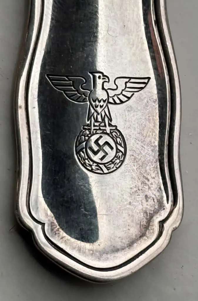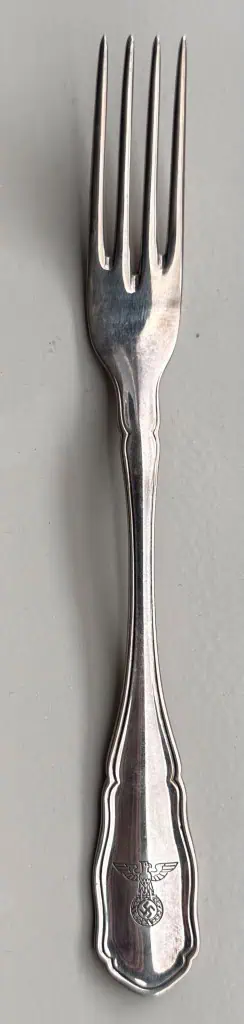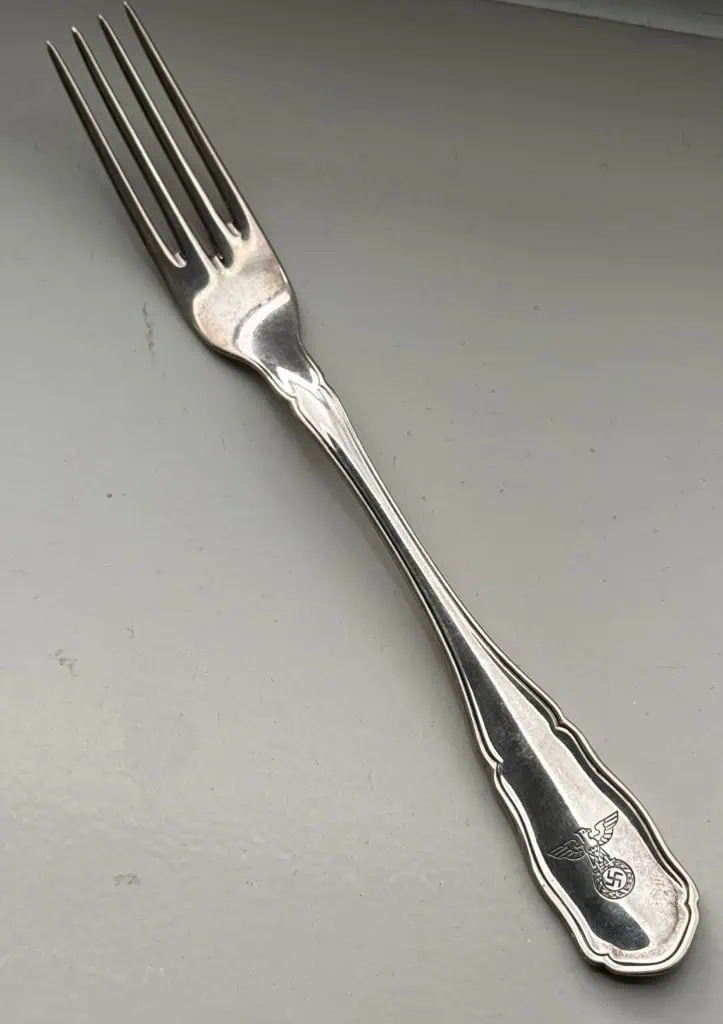Original “Bormann” Formal Pattern Silver Fork Recovered By A U.S. Veteran At Schloss Klessheim. This piece is from Castle Klessheim. This castle was located over the border from Obersalzberg, looking over the border from Obersalzberg in Austria. Many of the dignitaries, that were waiting to see Hitler, were housed at Kleissheim, as it was not far from the Berghof. This castle was maintained as a government residence, and therefore, had its own silver pattern that was used for meal service. These pieces come directly from Kleissheim, and they bear the markings of the Welner firm. These pieces are .800 silver, and they are marked on the reverse. Some collectors and historians call these the “Bormann Pattern” since this type was also found at Martin Bormann’s house on the Obersalzberg.  This fork   is in excellent condition with no issues. Brought home by a U.S. Veteran as a trophy of war. Third Reich silver was the ultimate war trophy for U.S. soldiers. 100% guaranteed to be authentic complete museum documentation (COA) provided.  Silver items always sell very fast when we get them. Don’t miss your chance to own a real museum authenticated piece with Museum provenance.  Third Reich Silver are a great investment item, and the prices keep going up and investment potential endless.  See our other pieces on our web site. First one of this high quality style we  have had in a long time