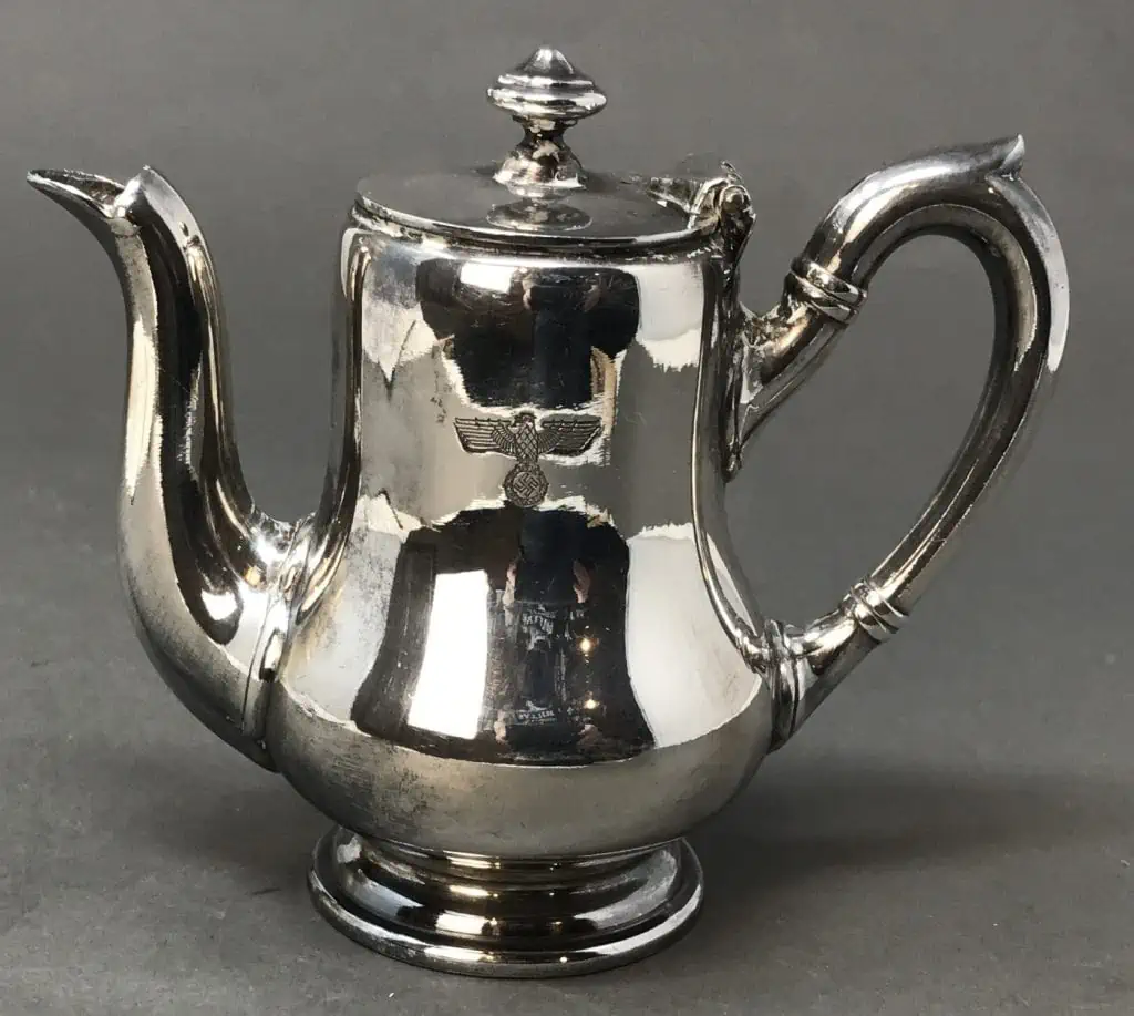 Original “Bormann” Formal Pattern Silver Tea Set Creamer Recovered By A U.S. Veteran At Schloss Klessheim. This tea service comes from Castle Klessheim. This castle was located over the border from Obersalzberg, looking over the border from Obersalzberg in Austria. Many of the dignitaries, that were waiting to see Hitler, were housed at Kleissheim, as it was not far from the Burghof. This castle was maintained as a government residence, and therefore, had its own silver pattern that was used for meal service. These pieces come directly from Kleissheim, and they bear the markings of the Welner firm, . These pieces are silver plate, and they are marked on the reverse. Some collectors and historians call these the “Bormann Pattern” since this type was also found at Martin Bormann’s house on the Obersalzberg. It is well known that Hitler drank tea and most likely used this very creamer himself when visiting. This creamer is the smaller version and is in excellent condition with no issues. Brought home by a U.S. Veteran as a trophy of war. Third Reich silver was the ultimate war trophy for U.S. soldiers. 100% guaranteed to be authentic complete museum documentation (COA) provided. Silver items always sell very fast when we get them. Don’t miss your chance to own a real museum authenticated piece with U.S. Veteran provenance. Third Reich Silver are a great investment item, and the prices keep going up and investment potential endless. If you have a tea pot you MUST get this! See our other pieces on our web site.