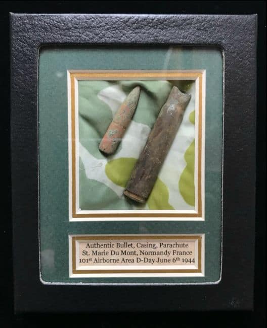Original Bullet, Shell And Parachute Relic From D-Day Normandy Band Of Brothers Area In Collector’s Glass Case