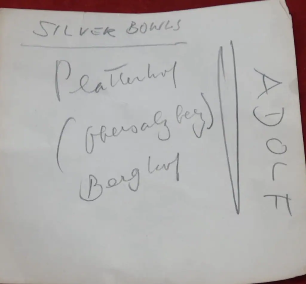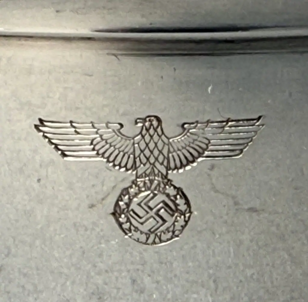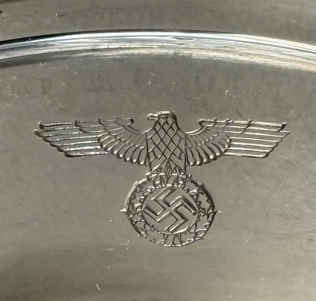 Original “Bormann” Formal Pattern Silver Ice Cream Bowl Recovered By A U.S. Veteran At Bormann’s House on the Obersalzberg Mountain next to the Berghof (Hitler’s House) . This piece come from the Bormann House from Obersalzberg a few yards from the Berghof. Bormann would sometimes entertain here and also at the Schloss Klessheim and therefore, had its own silver pattern that was used for meal service. These pieces come directly from Bormann’s House and they bear the markings of the Welner firm, . These pieces are silver plate, and they are marked on the reverse. It is in excellent condition with no issues. Brought home by a U.S. Veteran as a trophy of war. See copy of his note. It says it came from the Berghof but the two houses were often mistaken by U.S. Vets since they were so close so every piece of silver seemed to be labeled as “Hitlers” The note also said Platterhof that was also close to the Borman and Hitler house but they had their own pattern so that is not correct in the note. Third Reich silver was the ultimate war trophy for U.S. soldiers. 100% guaranteed to be authentic complete museum documentation (COA) provided. Silver items always sell very fast when we get them. Don’t miss your chance to own a real museum authenticated piece with U.S. Veteran provenance. Third Reich Silver are a great investment item, and the prices keep going up and investment potential endless. See our other pieces on our web site. The ice cream bowl is Extremely RARE! We only know of six of them! DO NOT MISS THIS!