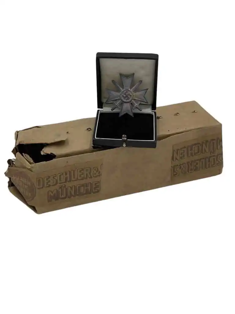 Original MINT SLEEVE OF 10 WWII German CASED WAR MERIT CROSS 1ST CLASS, 1939 WITH SWORDS Certified. The War Merit Cross was instituted by Adolf Hitler on October 18TH 1939, in two classes with both classes issued, with and without swords, for award to military personnel and civilians, including females and foreigners, for exemplary service and/or bravery in Germany’s war effort, in a non-combatant role. The addition of swords to the award signified bravery while awards without swords were bestowed for service. Die struck, alloy construction bravery award with silver finish is in the form of a Maltese style cross with a circular centerpiece with an embossed, canted, swastika encircled by an oak-leave wreath to the obverse. The swords, indicating bravery, emanated upwards between the arms of the cross. The background field of the obverse centerpiece is smooth while the arms of the cross have a pebbled background field with raised, smooth, outer edges. The plain, reverse has a soldered, solid style hinge, a broad, tapered, vertical pin and soldered catch is broken (see photo) . The award comes housed in a roughly, 7cm square, 2cm thick, pressed cardboard and wood construction case with a black, simulated grained leather covering. The top lid of the case has an impressed, silvered outline of the War Merit Cross with swords. The interior of the top lid is lined in white satin while the interior bottom of the case has a vertical cut-out to secure the hinge, pin and catch assembly of the badge. Maker marked number “1” for maker Deshler. in overall in good condition ALMOST MINT with some storage wear (see photos). original sleeve Unissued medals from the Deschler factory, discovered in the 2000 during a renovation. A near mint sleeve of 10 boxed in MINT condition in the factory paper wrap!. This set of 10 is still wrapped in its original paper bundle where they been stored since the day they were completed in the factory. The discovery of these medals is known as the ‘Deschler Hoard’. Gettysburg Museum Certified (COA) provided. 100% Guaranteed to be authentic. Sold for historic purposes only. See our other pieces on our web site. Also note when browsing our web site there are several pages of items, at the bottom of the list look for other page numbers. VERY NICE RARE Opportunity TO OWN A REAL WWII TIME CAPSULE , don’t miss it!
