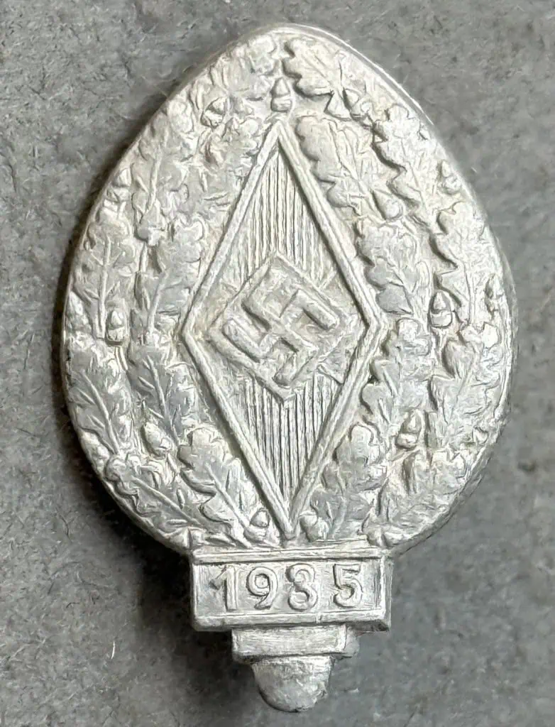 Original German Hitler Youth 1935 HJ YOUTH FESTIVAL SPORTS EVENT BADGE. (H.J. Reichsportwettkampf Abzeichen) Certified. Sports in the early period of the Third Reich had an underlying, subversive role as a form of military training, due to the restrictions imposed on the Germans by the Treaty of Versailles. As a result, sporting events were very highly regarded by the N.S.D.A.P. and all manner of awards were issued on a national and local level to the victorious athletes. Even after the treaty was ignored, and military conscription imposed, sporting events for the German youth were still held in high esteem as pre-military training and toughening-up exercises. From the end of 1934 Hitler Youth Sports Festivals were held throughout Germany. Originally called a “Sport-” or “Jugendfest,” after 1937 they came to be known as “Reichsportwettkampf” (National-sport-competition). Hitler Youths who had achieved an above average score in three sports contests were awarded badges with “Ehrenurkunden” (award certificates). Solid cast aluminum badge, roughly in the form of a vertical oval, comprised of the Hitler Youth diamond with a mobile swastika to its center, surmounted with a spray of oak leaves to either side and “1935” scrolled beneath. A vertical pin-back device is to the reverse, as is the embossed maker’s name. Gettysburg Museum Certified (COA) provided. Rare 100% Guaranteed to be authentic. Sold for historic purposes only. See our other pieces on our web site. Also note when browsing our web site there are several pages of items, at the bottom of the list look for other page numbers.