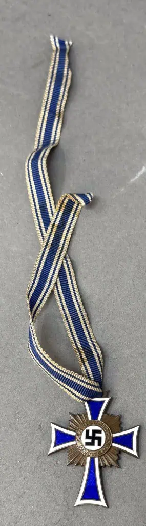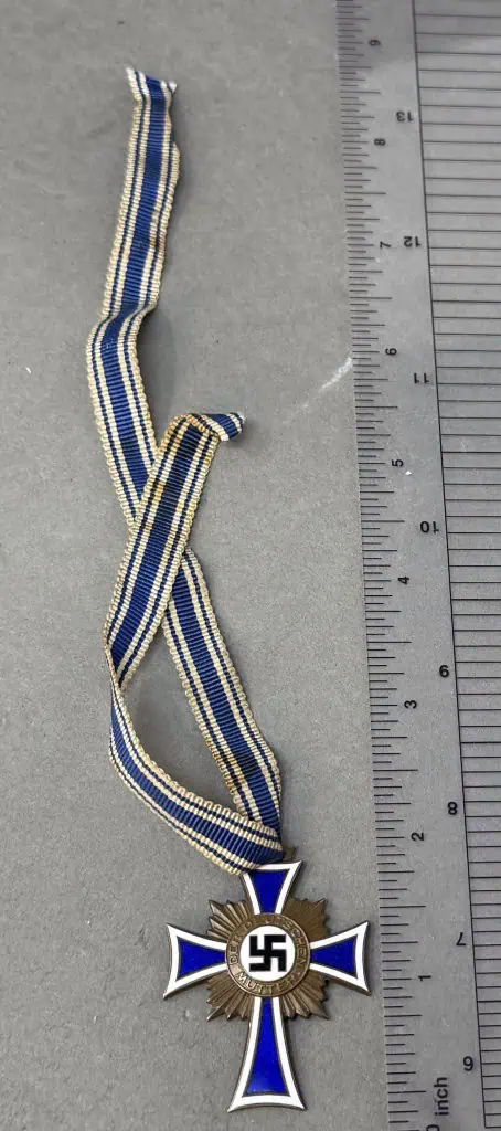 Original German Mother’s Cross Ehrenkreuz der Deutschen Mutter In Bronze. The Mother’s Cross was introduced by Adolf Hitler on December 16TH 1938 as part of a large propaganda campaign aimed at increasing the birth rate. The award was officially designated, Honor Cross of the German Mother, and was instituted in three grades to recognize and reward childbearing German females. The three grades consisted of the bronze cross for bearing four or five children, the silver cross for bearing six or seven children and the gold cross for bearing eight or more children. Criteria for the award included that the parents be of pure German blood, and that the mother was worthy of such an honor. Two-piece, stamped tombac award with a bronze wash and blue and white enamel work. Award in the form of a Christian cross with outward fluted arms in semi-translucent blue enamel with white enamel border. Cross has a raised sunburst pattern emanating between its arms. Separate central circular field with white enamel base and black static swastika, encompassed by a circular border with embossed Latin script, “Der Deutschen Mutter”, (The German Mother). Reverse has impressed simulated handwritten script, “16 December 1938”, and facsimile Hitler signature. Section of original ribbon is also included (see photo). Good condition with some storage age expected issues. We have several all are in good condition and have ribbons. We have several and will pick the best one for you. 100% Guaranteed to be authentic Complete Museum documentation (COA) Provided. Certified by The Gettysburg Museum of History. Please see our other items. Also note when browsing our web site there are several pages of items, at the bottom of the list look for other page numbers. NICE BUT USED EXAMPLE!