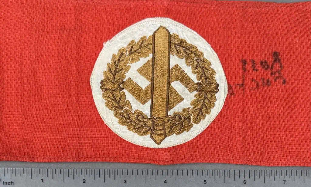 Original German NSDAP (NAZI PARTY) Brown Shirts SA MILITARY DEFENSE/TEAM SPORTS ARMBAND. (SA -Wehrmannschaften Armelbinde) With RZM Tag Certified. The “SA -Wehrmannschaft” (SA -Military-defense-training-groups) were formed in January 1939 as a response to Hitler’s decree for the SA to provide pre- and post-military defense training to all civilian males aged from 18 to 65 years old. Effectively a Home Guard comprised of those deemed unfit for regular military service due to age or partial infirmity, they wore a distinctive armband which incorporated the “SA -Wehrabzeichen” (SA Sports-badge) which, after July 1942, was restricted to wear on civilian clothing. The approximately 10cm x 45cm red cotton armband has a 9cm diameter white field sewn to it, upon which is the SA sports badge machine woven in copper-colored threads. The SA sports badge is in the form of an upright short sword against a mobile swastika surrounded by an oak leaf wreath. The armband’s vertical seam is to the reverse. Still has part the paper RZM tag attached. !. Nice bring back arm band in good but used condition. Gettysburg Museum Certified (COA) provided. Rare 100% Guaranteed to be authentic. Sold for historic purposes only. See our other pieces on our web site. Also note when browsing our web site there are several pages of items, at the bottom of the list look for other page numbers. Good EXAMPLE! WITH Partial RZM TAG! The Veteran who brought it home wrote his name inside (see photos).