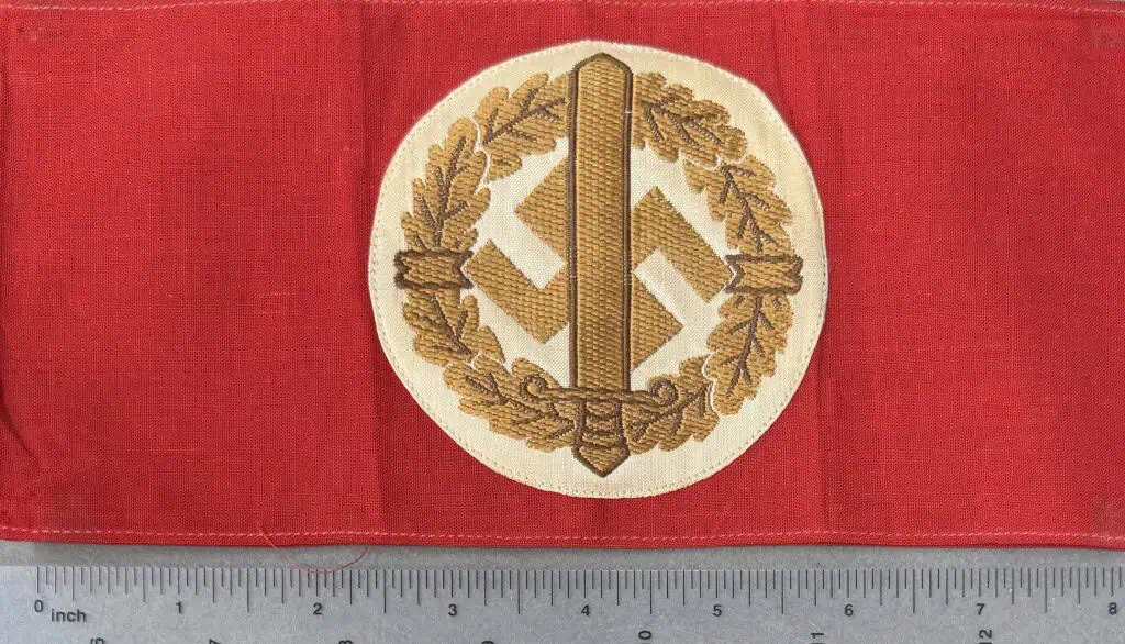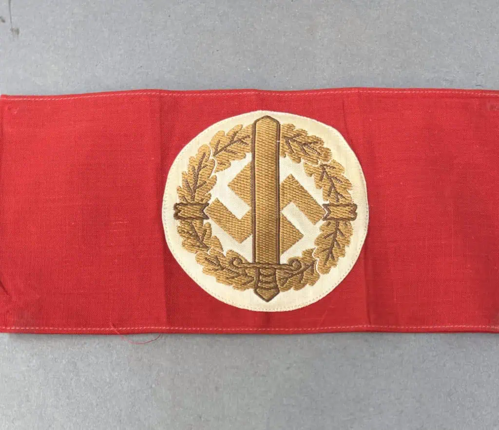 Original German NSDAP (NAZI PARTY) Brown Shirts SA MILITARY DEFENSE/TEAM SPORTS ARMBAND. (SA -Wehrmannschaften Armelbinde) With RZM Tag Certified. The “SA -Wehrmannschaft” (SA -Military-defense-training-groups) were formed in January 1939 as a response to Hitler’s decree for the SA to provide pre- and post-military defense training to all civilian males aged from 18 to 65 years old. Effectively a Home Guard comprised of those deemed unfit for regular military service due to age or partial infirmity, they wore a distinctive armband which incorporated the “SA -Wehrabzeichen” (SA Sports-badge) which, after July 1942, was restricted to wear on civilian clothing. The approximately 10cm x 45cm red cotton armband has a 9cm diameter white field sewn to it, upon which is the SA sports badge machine woven in copper-colored threads. The SA sports badge is in the form of an upright short sword against a mobile swastika surrounded by an oak leaf wreath. The armband’s vertical seam is to the reverse. Still has the paper RZM tag attached. !. Nice bring back arm band in good but used condition. Gettysburg Museum Certified (COA) provided. Rare 100% Guaranteed to be authentic. Sold for historic purposes only. See our other pieces on our web site. Also note when browsing our web site there are several pages of items, at the bottom of the list look for other page numbers. Good EXAMPLE! WITH RZM TAG!