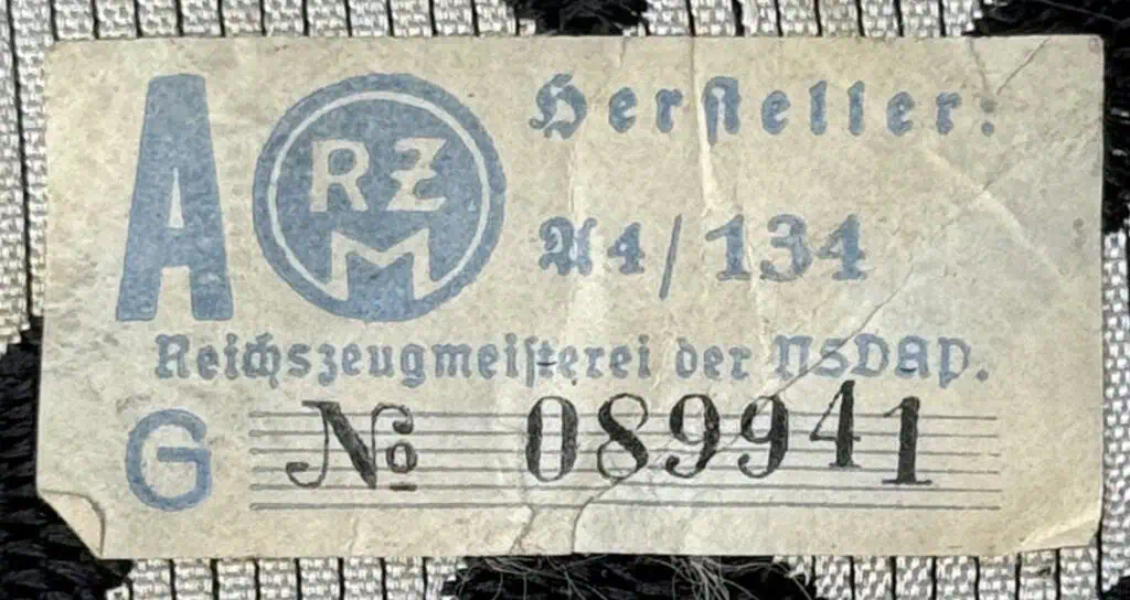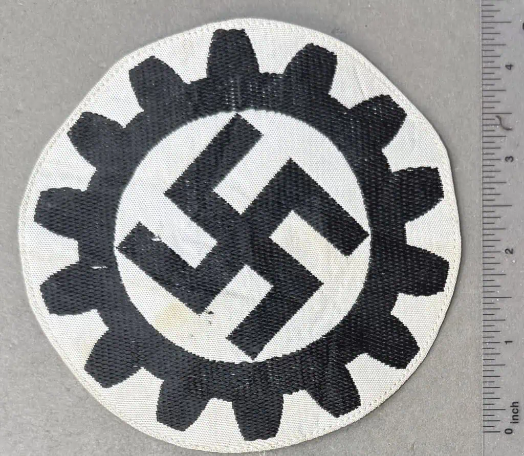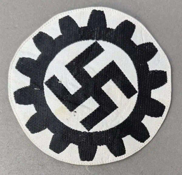 Original German NSDAP (NAZI PARTY) DAF MEMBER’S SPORTS SHIRT INSIGNIA. (DAF Sportabzeichen) WITH RZM TAG Certified. With the dissolution of all Free Trade Unions in Germany in May 1933 the Deutsche Arbeitsfront, (German Labour Front), was established to replace the unions and to educate the workers in industry and commerce for smooth and efficient operation of all labor in the Third Reich. In October 1934 the DAF was given official status as a sub-section of the NSDAP and in March 1936 it was recognized as an independent NSDAP affiliated association and granted control of its own monetary budget. Sports shirt insignia as introduced in January 1938. Machine woven insignia features the DAF emblem of a fourteen tooth cog wheel encompassing a canted swastika, in black on a 125mm diameter white woven rayon base. Reverse has white paper RZM tag with blue printed script and black ink stamped numerals. Nice example issued with expected storage wear. Gettysburg Museum Certified (COA) provided. Rare 100% Guaranteed to be authentic. Sold for historic purposes only. See our other pieces on our web site. Also note when browsing our web site there are several pages of items, at the bottom of the list look for other page numbers. A Classic insignia with RARE RZM TAG!!