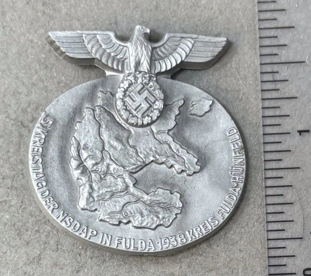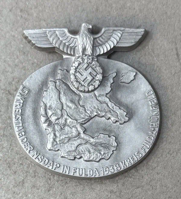 Original German NSDAP (NAZI PARTY) Kreistag der NSDAP 1938 Fulda-Hünfeld Badge Certified. Badge is constructed out of an injection molded silver bakelite base. The round shaped obverse features a closed winged national eagle clutching a wreathed swastika in its talons, above a shield of Coat of arms flanked by a laurel leaf and berry cluster and “1938” (right) Painted light grey plastic material highly detailed with the National eagle over the landmass. Reads, “5 Kreistag der NSDAP in Fulda 1938 Kreis Fulda-Hünfeld”. Marker marked to reverse as shown, excellent condition. 100% Guaranteed to be authentic Brought home by a U.S. solider as a trophy of war. Complete museum documentation (COA) Provided. Certified by The Gettysburg Museum of History. The Gettysburg Museum of History does not support or condone Adolf Hitler or the Nazi Party and is only offering this as a historic relic. Please see our other items. Also note when browsing our web site there are several pages of items, at the bottom of the list look for other page numbers.