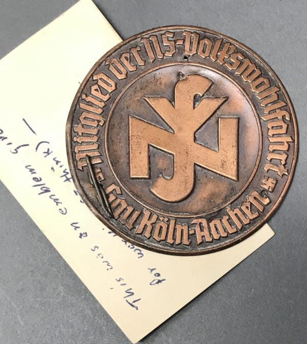 Original German NSDAP (NAZI PARTY) NSV MEMBER’S DOOR PLAQUE. (NSV Tür-Plakette) Brought Home By A U.S. Solider WITH TAG Certified. The NSV, National Sozialistische Volkswohlfahrt, (National Socialist People’s Welfare Organization), was an NSDAP affiliated organization formed in May 1933 from personnel of the preceding DVD. Deutscher Volkswohl Dienst, (German Social Welfare Service), instituted by Otto von Bismarck. The NSV was responsible for a wide range of Social services including the WHW, Winter Hilf Werk, (Winter Assistance Work), and worked closely with the DRK, Deutsches Rotes Kreuz, (German Red Cross). Roughly 75 mm die-stamped, bronze washed alloy. For the area of Gau Berlin. IT Has an old tag from the U.S. Veteran who brought it home! Scarce. Nice example showing the expected minor age and wear overall good condition. One of the classic desirable collector’s items from the third Reich in used but in good but used condition. Gettysburg Museum Certified (COA) provided. 100% Guaranteed to be authentic. Sold for historic purposes only. See our other pieces on our web site. Also note when browsing our web site there are several pages of items, at the bottom of the list look for other page numbers. don’t miss it! RARE!