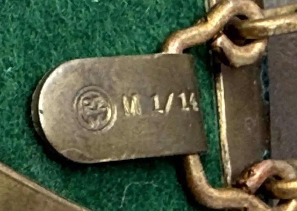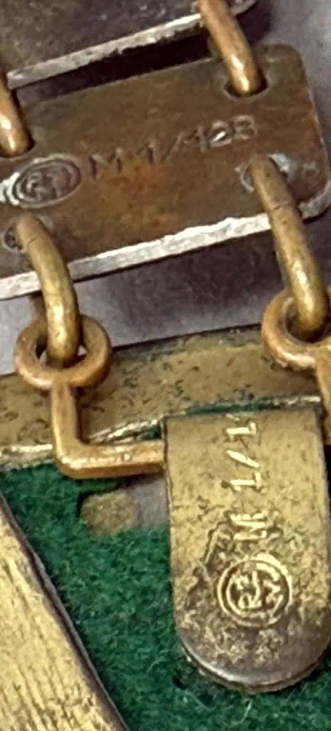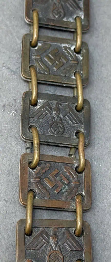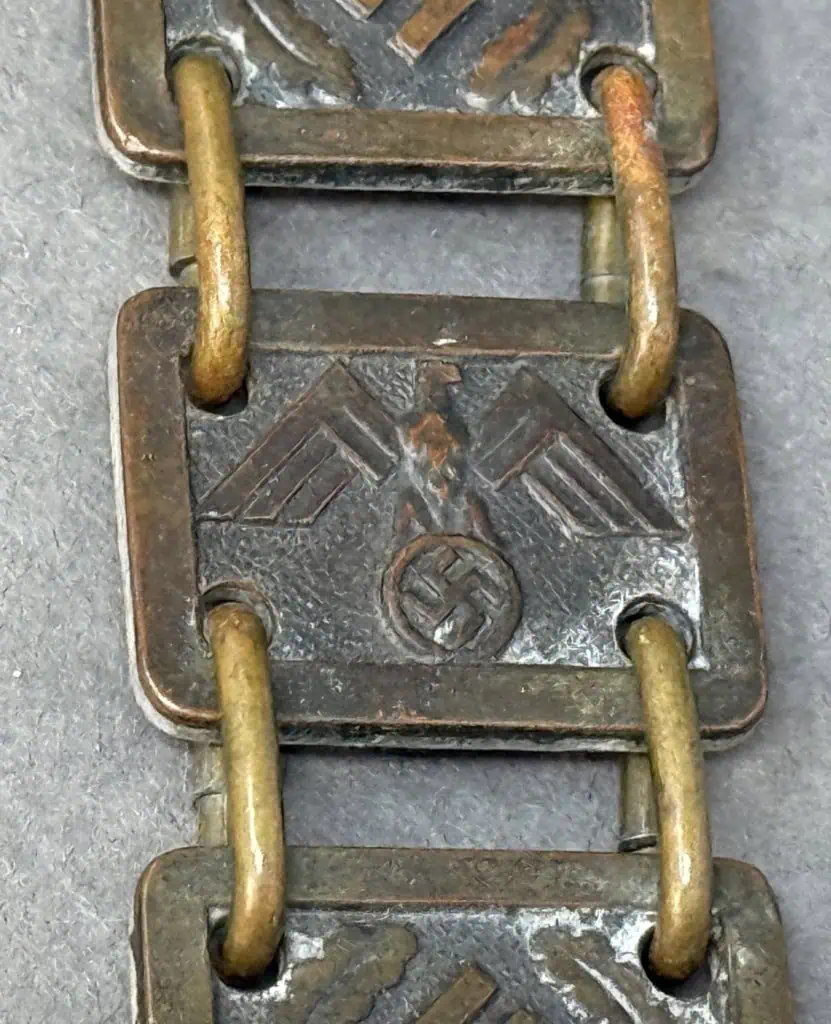Original GERMAN NSDAP (NAZI PARTY) POLITICAL LEADER FLAG BEARER’S GORGET WITH CHAIN . (Politisches Leiter Ringkragen) Chain Certified. The NSDAP, Nationalsozialistische Deutsche Arbeiterpartei, (National Socialist German Worker’s Party), was originally founded in Munich as the DAP, Deutsche Arbeiterpartei, (German Worker’s Party), on January 5TH 1919. When Adolf Hitler joined the DAP in the autumn of 1919 he was to reform what was basically a debating society into an active political party. Appointed as the first chairman of the party on July 29TH 1921 Hitler was to restructure it along para-military lines in a hierarchy of four levels of government. In the midsummer of 1920 Hitler adopted the swastika as the premier symbol of the NSDAP and the first official swastika party flags were introduced. Shortly after Hitler gained national political power in 1933 he abolished the Weimar era national tri-color flag of black, red, and gold and reverted to the Hohenzollern Empire tri-color flag in black, white and red, which was to be flown in conjunction with the NSDAP swastika flag. Finally this dual flag arrangement was settled on September 15TH 1935, when the swastika flag was announced as the official national and mercantile flag of Germany. With a deep understanding of pageantry and symbolism, and its propaganda and psychological effectiveness, the NSDAP went to great lengths to reinforce their political party to the general populace of Germany, with repetitive slogans and the omnipresent use of the swastika. Swastikas adorned banners, pennants and assorted unit and the national flags and were utilized at every possible opportunity. The use of gorgets can be traced as far back as the ancient use of armor by the Roman Legions, (Circa 350 BC), evolving into protective armored collar bone and neck plates during the 14TH century. The word Gorget also evolved from the ancient French gorget, meaning throat. By the 17TH century the full suits of armor were seldom utilized anymore but the gorget remained, in an altered form, as a sign of rank or position and continued in use, as such, through-out the Napoleonic wars, the German wars of liberation and on into World War I and World War II. The NSDAP Political Leader, Flag Bearer’s gorget was introduced in April 1939, for wear by the Flag Bearer at all political functions where the unit and/or the national flag was to be displayed. Interestingly the Political Leader, Flag Bearer’s were not issued with identifying sleeve insignia, as were their military counterparts. Of Note: The RZM, Reich Zeug Meisterei, (National Equipment Quartermaster), was officially founded in June 1934 in Munich by the NSDAP as a Reich Hauptamt, (State Central Office), and was based on the earlier SA ,Sturm Abteilung, (Storm/Assault Detachment), Quartermaster’s Department. The functions of the RZM were not only to procure and distribute items to Party formations, but also to approve chosen designs and to act as a quality control supervisor to ensure items manufactured for the Party met required specification and were standardized. All NSDAP political leader’s uniform items and insignia including the flag bearer’s gorget fell under RZM control and as a result carried the RZM’s approval marking. Stamped alloy gorget with chain with a bronze wash. bronze washed, embossed national eagle with outstretched wings mounted and alternating swastika links.. Both the gorget and the chain is RZM marked . In good but used condition. Gettysburg Museum Certified (COA) provided. 100% Guaranteed to be authentic. Sold for historic purposes only. See our other pieces on our web site. Also note when browsing our web site there are several pages of items, at the bottom of the list look for other page numbers. Great artifact! don’t miss it! Good CONDITION some patina and expected issues Great example!