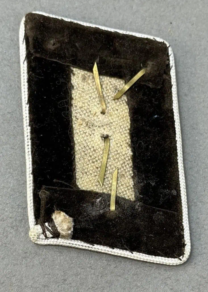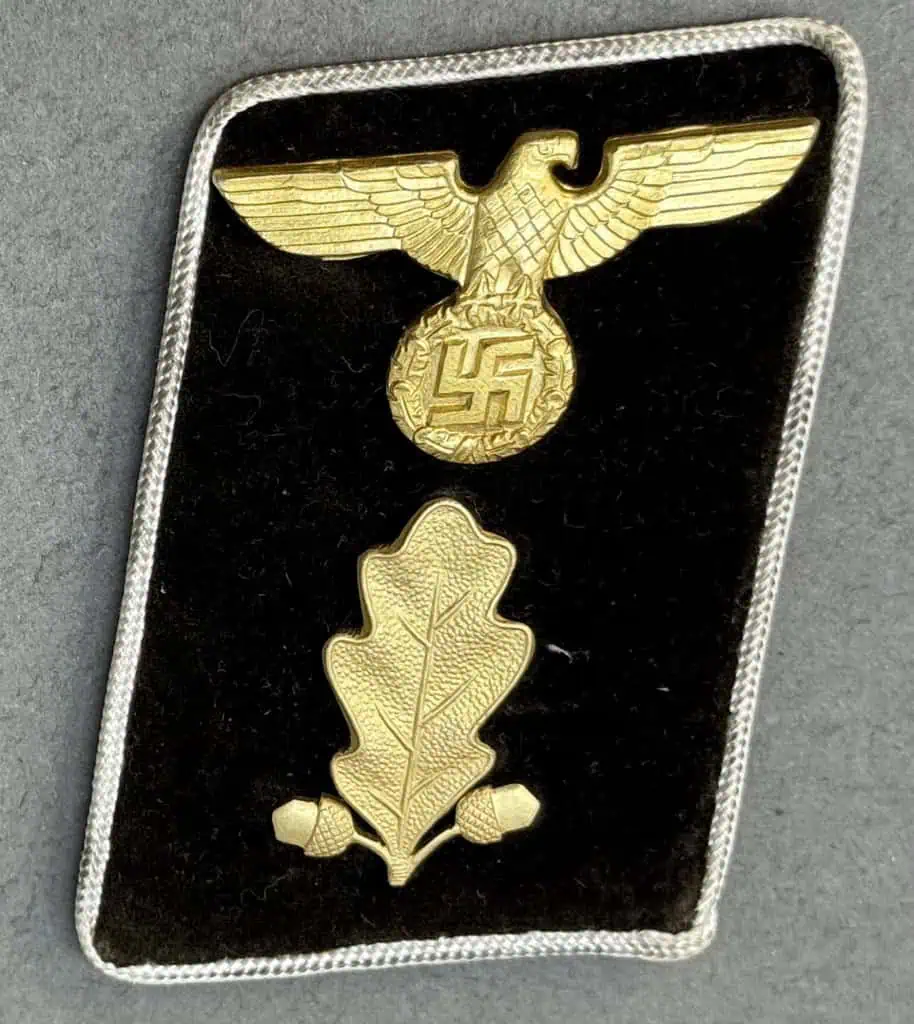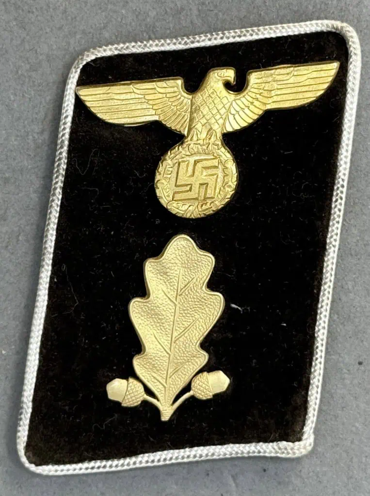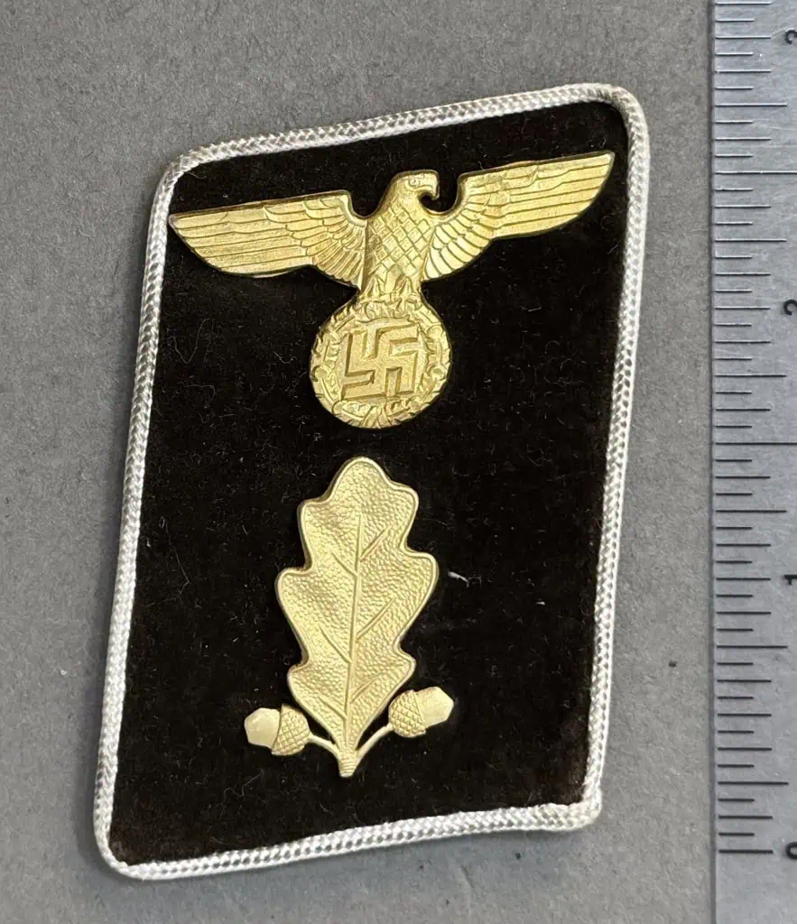 Original German NSDAP (Nazi Party) Political Leader KREISLEITUNG LEVEL, SECTION LEADER’S COLLAR TAB. (Kragenspiegel) Certified. “Nationalsozialistische Deutsche Arbeiterpartei” (National-socialist German Workers’-party), was originally founded, in Munich, in January of 1919. Known then as the DAP, “Deutsche Arbeiterpartei” (German Workers’-party), when Adolf Hitler joined it, in the autumn of 1919, he set about reforming what was basically a debating society into an active political party. Appointed as its first chairman in July of 1921, Hitler restructured the party along para-military lines in four ascending levels of government, consisting of the “Ortsgruppe,” the “Kreisleitung,” the “Gauleitung,” and the “Reichsleitung,” with each group being distinguished by a specific color of piping on the collar tabs and visor cap. Uniform regulations for Nazi political leaders were addressed as early as 1920, underwent numerous modifications, and were largely finalized by May of 1939. A Set of “Kreisleitung” (District-level) collar tabs, as indicated by their post-1938 white piping, in the form of 45mm wide and 65mm tall, brown velvet parallelograms. This fourth, and final, pattern collar tab features an alloy eagle, whose spread wings have a span of 40mm, clutching a wreathed, static swastika in its talons, as worn between 1939-45. Beneath the eagle is a gilt washed alloy, vertical oak leaf, with an acorn to either side of its base. These indicate an “Abschnittsleiter” (Section-leader) rank. To the reverse of the collar tab, the edges of its brown velvet obverses is folded inwards and glued to a buckram backing, and the three attachment prongs for each eagle, and the two attachment prongs for each oak leaf, protrude through the buckram and velvet where they are then folded over. Shows the expected age and use. Nice example showing the expected minor age and wear overall good condition. In Excellent but used condition. Gettysburg Museum Certified (COA) provided. 100% Guaranteed to be authentic. Sold for historic purposes only. See our other pieces on our web site. Also note when browsing our web site there are several pages of items, at the bottom of the list look for other page numbers. RARE artifact! don’t miss it! EXCELLENT condition! Great example.