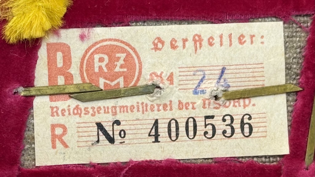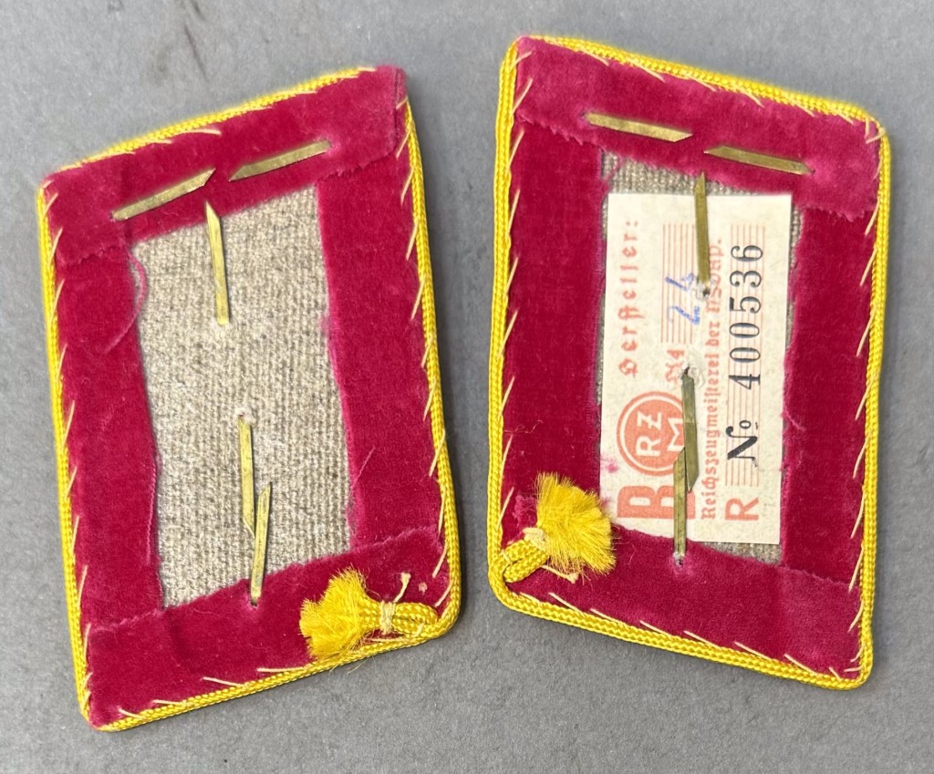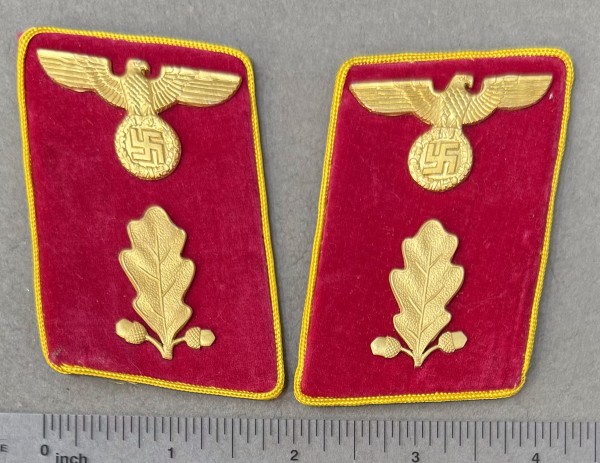 Original German NSDAP (Nazi Party) Matching Set Of Political Leader GAULEITUNG LEVEL, HAUPT-ABSCNHITTSLEITER’S COLLAR TAB. (Kragenspiegel) Certified. The NSDAP, “Nationalsozialistische Deutsche Arbeiterpartei” (National-socialist German Workers’-party), was originally founded, in Munich, in January of 1919. Known then as the DAP, “Deutsche Arbeiterpartei” (German Workers’-party), when Adolf Hitler joined it, in the autumn of 1919, he set about reforming what was basically a debating society into an active political party. Appointed as its first chairman in July of 1921, Hitler restructured the party along para-military lines in four ascending levels of government, consisting of the “Ortsgruppe,” the “Kreisleitung,” the “Gauleitung,” and the “Reichsleitung,” with each group being distinguished by a specific color of piping on the collar tabs and visor cap. Uniform regulations for Nazi political leaders were addressed as early as 1920, underwent numerous modifications, and were largely finalized by May of 1939.  “Gauleitung” (Head Zone Leader) collar tabs. Tabs are construction on a red velvet base, with gold rayon piping. Approximate size is 70mm x 45mm. Collar tab features a gilt-washed national eagle, with a wing span of 40mm, clutching a wreathed, static swastika in its talons, as worn between 1939-45. Beneath the eagle is similarly pinned a gilt alloy, single oak leaf, with an acorn to either side of its base, This combination indicates an “Haupt-AbscnhittsLeiter” rank.  Nice example showing the expected minor age and wear overall good condition.  In Excellent but used condition. Gettysburg Museum Certified (COA) provided. 100% Guaranteed to be authentic. Sold for historic purposes only. See our other pieces on our web site. Also note when browsing our web site there are several pages of items, at the bottom of the list look for other page numbers. RARE artifact! don’t miss it! Excellent  CONDITION! . One tab still has the paper RZM tag Great matching  example!