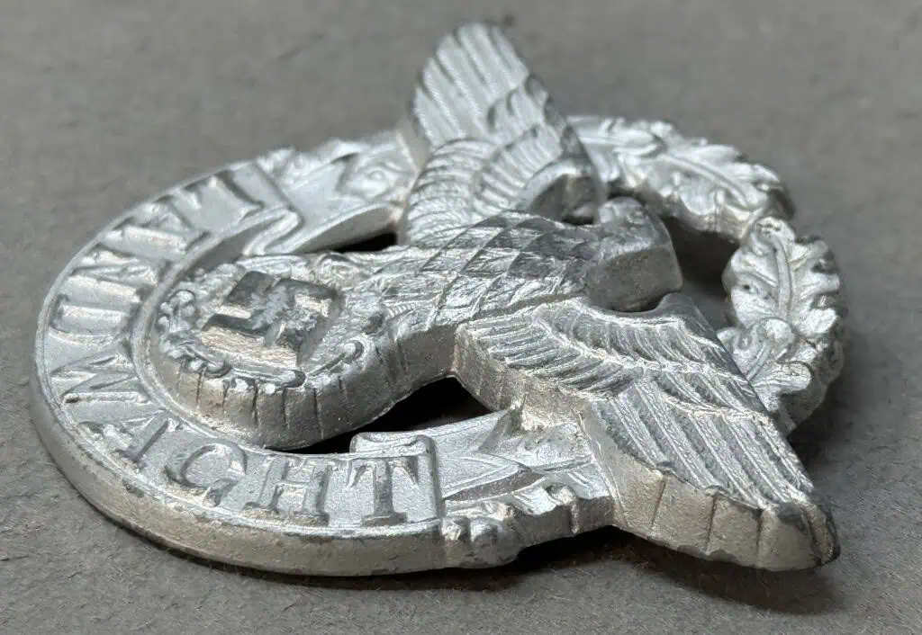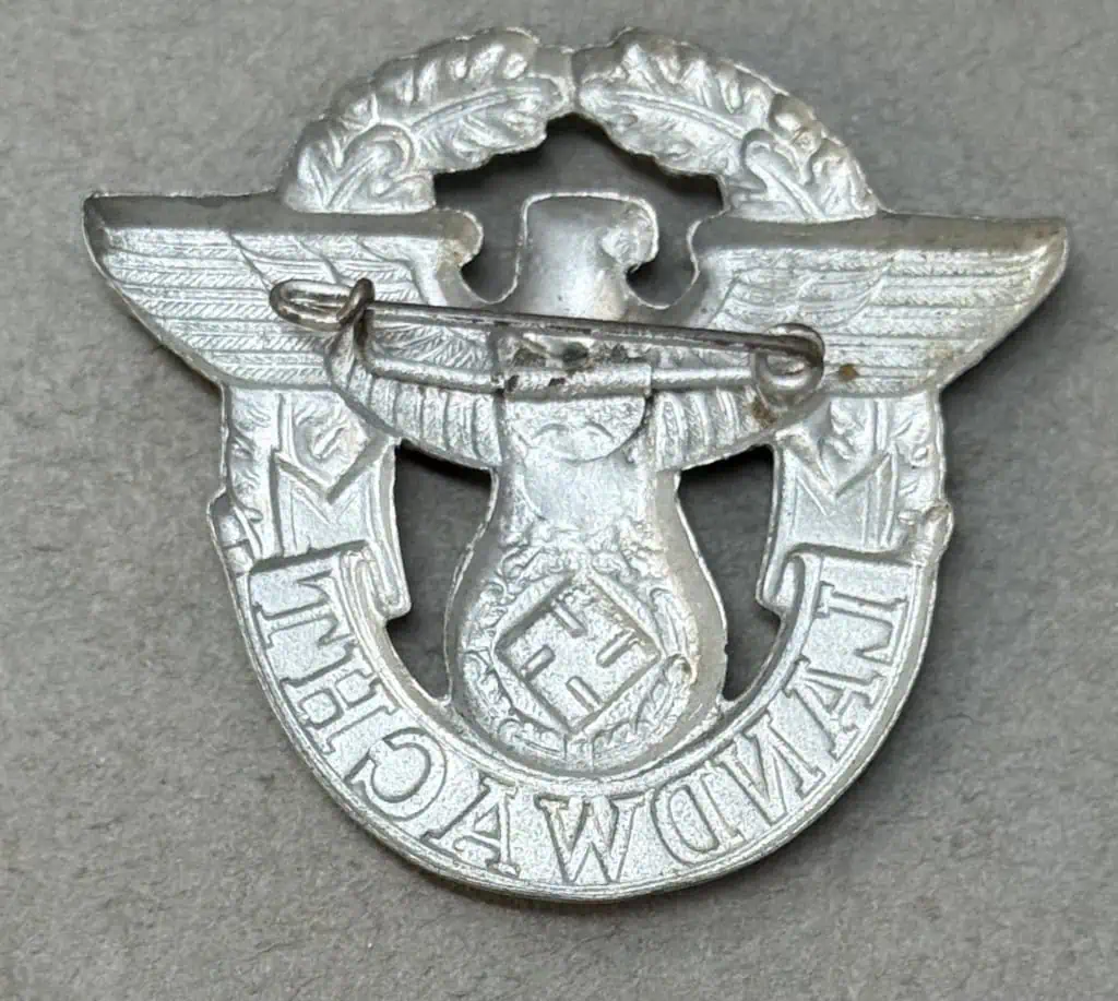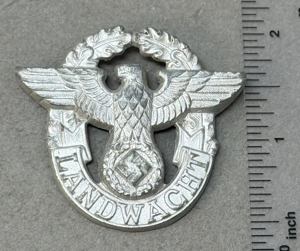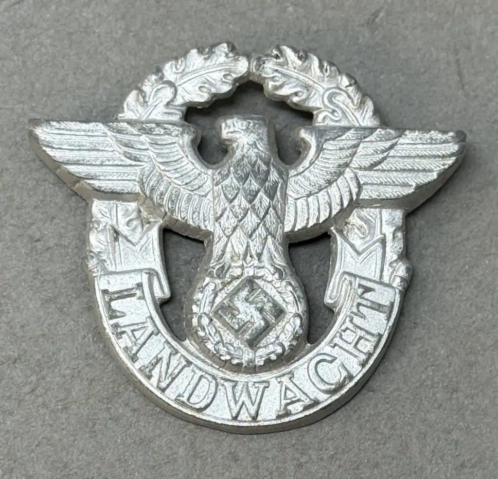 Original German NSDAP (NAZI PARTY) Rural Landwacht POLICE VISOR CAP EAGLE (Mützenadler) Certified. Shortly after Adolf Hitler and the NSDAP, Nationalsozialistische Deutsche Arbeiterpartei, (National Socialist German Worker’s Party), ascended to the leadership of Germany, the police, as with almost all civic organizations, incorporated the new style national eagle and swastika on their insignia. The first pattern police insignia to utilize the new style national eagle and swastika was introduced on April 23RD 1934. On June 17TH 1936, Reichsführer-SS Heinrich Himmler was appointed to the newly created position of Chef der Deutschen Polizei im Reichsministerium des Innern, (Chief of the German Police in the National Ministry of the Interior), effectively giving him full control of all police agencies within Germany. As a result of this appointment and the restructuring of all the separate German state police into a single national police force new regulations were instituted to bring about uniformity in dress for all police through-out the country. One of the new uniform regulations of June 25TH, 1936 was the introduction of a slightly modified second pattern police eagle and swastika to replace the first pattern. The police pattern national eagle was worn on all types of headgear including the visor caps, overseas cap and the M43 field cap. The insignia utilized on the visor caps was of stamped metal construction while the insignia on the soft caps was machined or handstitched. Second pattern, police cap eagle as introduced on June 25TH 1936 to replace the earlier, (Circa April 1934-June 1936), first pattern cap eagle. The single piece, silver washed, die stamped, aluminum alloy construction, right facing eagle features out-stretched wings and is clutching a canted swastika in its talons. The eagle is superimposed on an embossed, vertically oval, oak-leaf wreath with the eagle’s wings extending beyond the outer edges of the wreath with a roughly, 55mm wingspan. The eagle and the wreath both have nice high relief detailing, and the insignia is slightly convexed to fit the contours of a cap. Bottom has the word Landwacht on a scroll. the original attachment pin is intact. 100% Guaranteed to be authentic Brought home by a U.S. solider as a trophy of war. Complete museum documentation (COA) Provided. Certified by The Gettysburg Museum of History. The Gettysburg Museum of History does not support or condone Adolf Hitler or the Nazi Party and is only offering this as a historic relic. Please see our other items. Also note when browsing our web site there are several pages of items, at the bottom of the list look for other page numbers. OUTSTANDING SCARCE Eagle! Don’t Miss It!
