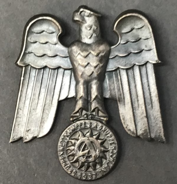 Original German NSDAP (NAZI PARTY) S.A. Brownshirts 1937 GRUPPE HOCHLAND DAY BADGE. Certified. A roughly 50mm x 45mm stamped alloy construction badge. The badge is in the form of an eagle clutching a circular disk. The disk has the SA insignia superimposed on the sun, surrounded by the embossed text, “Gruppenwettkampfe S.A. Gruppe Hochland 1937”. Complete with pinback device very light wear some light surface rust on the back this does not affect the front. Scarce. Nice example showing the expected minor age and wear overall good condition. One of the classic desirable collector’s items from the third Reich in used but in good but used condition. Gettysburg Museum Certified (COA) provided. 100% Guaranteed to be authentic. Sold for historic purposes only. See our other pieces on our web site. Also note when browsing our web site there are several pages of items, at the bottom of the list look for other page numbers. Great badge BIG EAGLE! don’t miss it! VERY RARE!