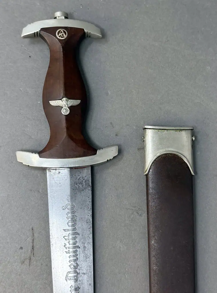 Original German NSDAP (NAZI PARTY) SA (Brown Shirts) Ground Rohm Dagger  with Scabbard Certified. An early pattern SA Dagger, It comes compete with an original scabbard. The dagger has solid nickel silver fittings throughout. The crossguards and tang nut are in very good condition throughout with all fittings having an aged patina. There is some age to these mounts no lifting anywhere, showing that they are solid and not plated. They show wear with almost some denting and scratches. The lower reverse guard is good/ The grip has a lovely dark reddish-brown color, with medium center ridge construction, with lots of wear and a few small dents and cracks. This grip is in good condition and fits the crossguards nicely, though there are cracks on both sides of the grip near the pommel fitting. There is no movement in the guards or grips, the pommel nut worn. The SA symbol button  has most of the enamel intact, with the nickel plating intact. The grip eagle is a fine example being the style with beak that points straight. It has just a bit of verdigris on it, showing that it is solid nickel alloy, though it has some slight oxidation. The details are still there to the eagle to include the beak, breast feathering, wing feathering, talons, wreath and mobile swas (hook cross). This fine example  dagger was marked with the company’s  name and address marking completely ground off when the blade was ground. The blade is in fair condition, with some oxidation, and wear from the runners. The blade has correctly not been sharpened post manufacture, though it is actually relatively sharp, apparently from the factory. The acid-etched Alles für Deutschland (Everything for Germany) SA motto is crisp. . The reverse of the blade has some evidence of removal of the Ernst Rohm dedication being removed, making this a HISTORIC GROUND ROHM DAGGER! When Ernst Rohm was executed after the “Night Of The Long Knives” his presentation daggers were ordered to have his name removed. They had their presentation either ground off with a wire wheel or a file! This one has grind marks, but it was polished to make it look nicer by the original S.A. owner. The scabbard shell is straight throughout and is the early-war style, which has a brown “anodized” finish on the steel, which was then lacquered. It still retains much of the original finish, though the lacquer and paint has flaked off in many places, which has allowed the brown finish to fade somewhat. The upper and lower fittings are solid nickel silver, with a great look and just some light wear. The chape has dents at the end. The throat nicely matches the crossguards, and all fittings have their original dome headed screws, which do not show any signs of turning.   A fair condition early war SA Ground Rohm dagger  complete with scabbard. Ready to display a entry level dagger priced according to condition! 100% Guaranteed to be authentic Brought home by a solider as a trophy of war! Complete museum documentation (COA) Provided. Certified by The Gettysburg Museum of History. The Gettysburg Museum of History does not support or condone Adolf Hitler or the Nazi Party and is only offering this as a historic relic. Please see our other items.    Also note when browsing our web site there are several pages of items, at the bottom of the list look for other page numbers. Don’t miss it! OU U.S. VET Bring Back EXAMPLE! Classic Maker, good early-period dagger! FAIR CONDITION PRICED FAIR FOR CONDTION!!!!