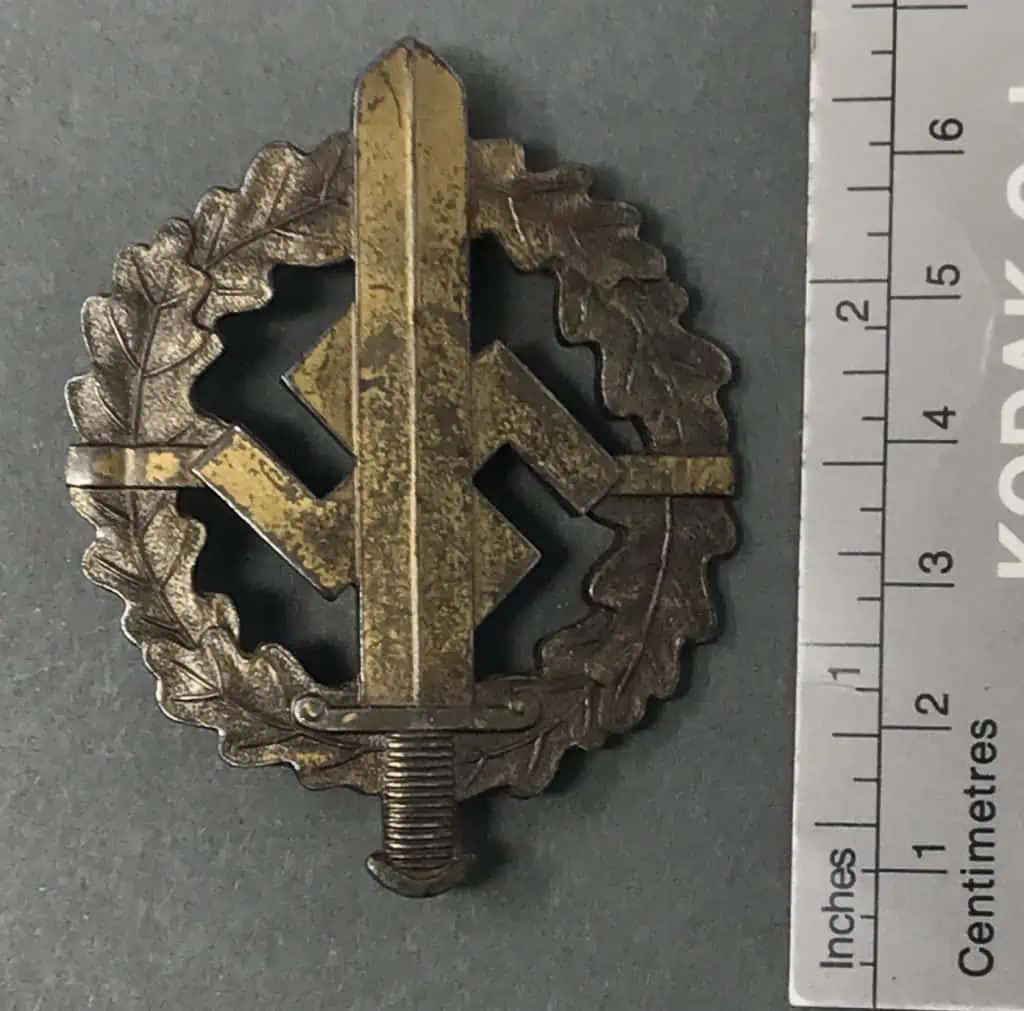 Original German NSDAP (NAZI PARTY) SA/SS Sports Badge In Bronze (SA-Sportabzeichen) Certified. The SA, Sturmabteilung, (Storm/Assault Detachment), was originally formed in the August 1921 as a protective guard unit for the political leaders of the fledgling NSDAP, Nationalsozialistische Deutsche Arbeiterpartei, (National Socialist German Worker’s Party), and as with the NSDAP the SA was structure along para-military lines. The SA recruited most of its personnel from the ranks of the various Freikorps groups composed mainly of disgruntled ex-soldiers and was first utilized at a NSDAP meeting in Munich in November 1921. The SA Sports badge in bronze was instituted by SA-Stabschef Ernst Röhm on November 28TH 1933, for award to SA and SS personnel who passed the required criteria in physical fitness, military defence and field exercises. On February 15TH 1935, in an attempt to inspire the German public to greater levels of physical fitness, Hitler conferred official national status to the badge and expanded it to include a silver and gold grade. When the badges gained official national status, bestowal was opened to all German nationals who were strongly encouraged to qualify for award of one of the three grades. Die struck, magnetic sheet metal, badge with a bronze wash. The badge is in the form of a circular oak-leaf wreath encompassing an upward pointing Roman broad sword which is superimposed on a central, canted swastika. Detailing includes veins to the oak-leaves, horizontal ribbing to the sword grip and cut-outs to the interior of the circular wreath and swastika arms. Reverse is a mirror image of obverse. Raised soldered catch, semi-rounded vertical pin and soldered catch all intact to reverse is well marked with embossed, “Eigentum der Obersten S.A. Führung”, (Property of the SA Supreme Command). Reverse also has embossed manufacturers name and location. Excellent example. Some wear and expected issues. Complete museum documentation (COA) Provided. Certified by The Gettysburg Museum of History. The Gettysburg Museum of History does not support or condone Adolf Hitler or the Nazi Party and is only offering this as a historic relic. Please see our other items. Also note when browsing our web site there are several pages of items, at the bottom of the list look for other page numbers. CLASSIC SA Badge. OUTSTANDING EXAMPLE!