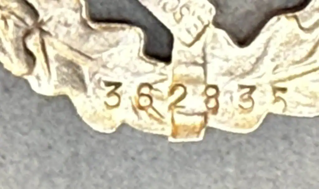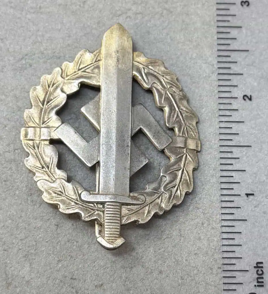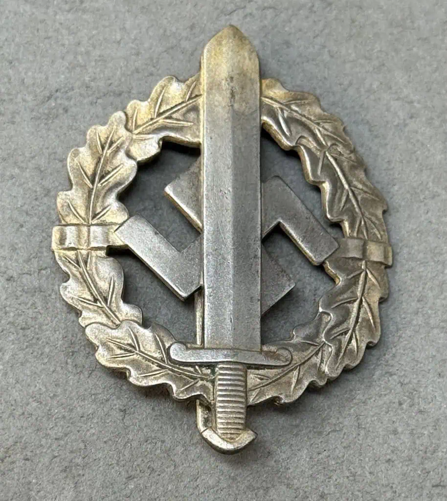 Original German NSDAP (NAZI PARTY) SA/SS Sports Badge In Bronze (SA-Sportabzeichen) Certified. The SA, Sturmabteilung, (Storm/Assault Detachment), was originally formed in the August 1921 as a protective guard unit for the political leaders of the fledgling NSDAP, Nationalsozialistische Deutsche Arbeiterpartei, (National Socialist German Worker’s Party), and as with the NSDAP the SA was structure along para-military lines. The SA recruited most of its personnel from the ranks of the various Freikorps groups composed mainly of disgruntled ex-soldiers and was first utilized at a NSDAP meeting in Munich in November 1921. The SA Sports badge in bronze was instituted by SA-Stabschef Ernst Röhm on November 28TH 1933, for award to SA and SS personnel who passed the required criteria in physical fitness, military defense and field exercises. On February 15TH 1935, in an attempt to inspire the German public to greater levels of physical fitness, Hitler conferred official national status to the badge and expanded it to include a silver and gold grade. When the badges gained official national status, bestowal was opened to all German nationals who were strongly encouraged to qualify for award of one of the three grades. Die struck, magnetic sheet metal, badge with a bronze wash. The badge is in the form of a circular oak-leaf wreath encompassing an upward pointing Roman broad sword which is superimposed on a central, canted swastika. Detailing includes veins to the oak-leaves, horizontal ribbing to the sword grip and cut-outs to the interior of the circular wreath and swastika arms. Reverse is a mirror image of obverse. Raised soldered catch, semi-rounded vertical pin and soldered catch all intact to reverse is well marked with embossed, “Eigentum der Obersten S.A. Führung”, (Property of the SA Supreme Command). Reverse also has embossed manufacturers name and location. Excellent example. Some slight wear and expected issues. Complete museum documentation (COA) Provided. Certified by The Gettysburg Museum of History. The Gettysburg Museum of History does not support or condone Adolf Hitler or the Nazi Party and is only offering this as a historic relic. Please see our other items. Also note when browsing our web site there are several pages of items, at the bottom of the list look for other page numbers. CLASSIC SA Badge. OUTSTANDING EARLY NUMBERED EXAMPLE!