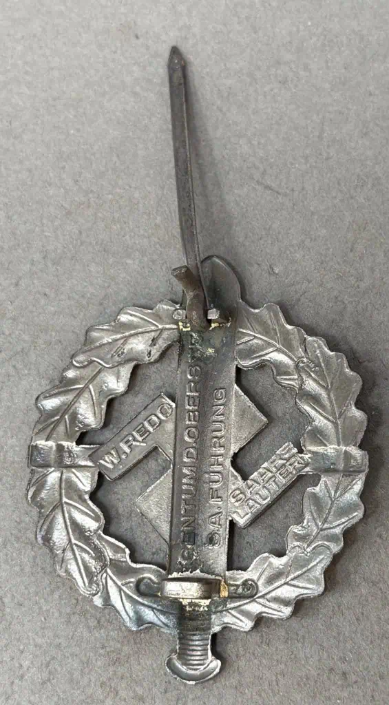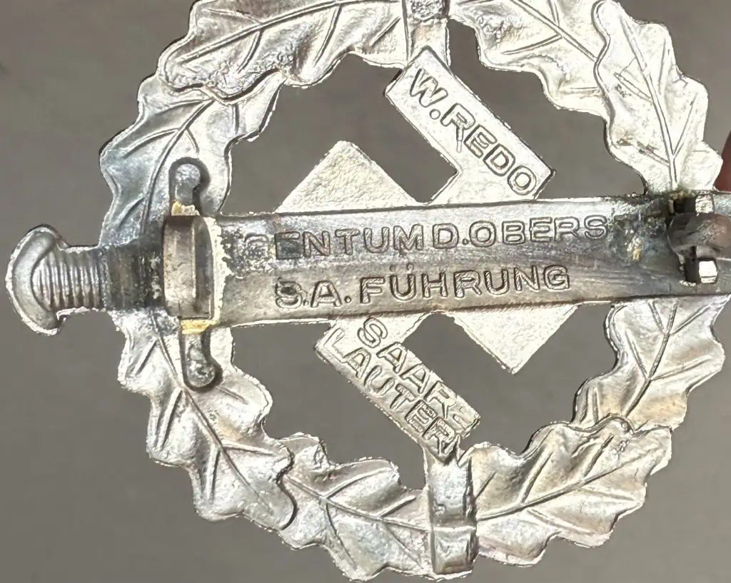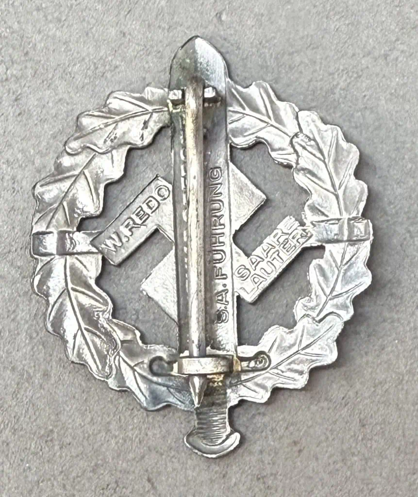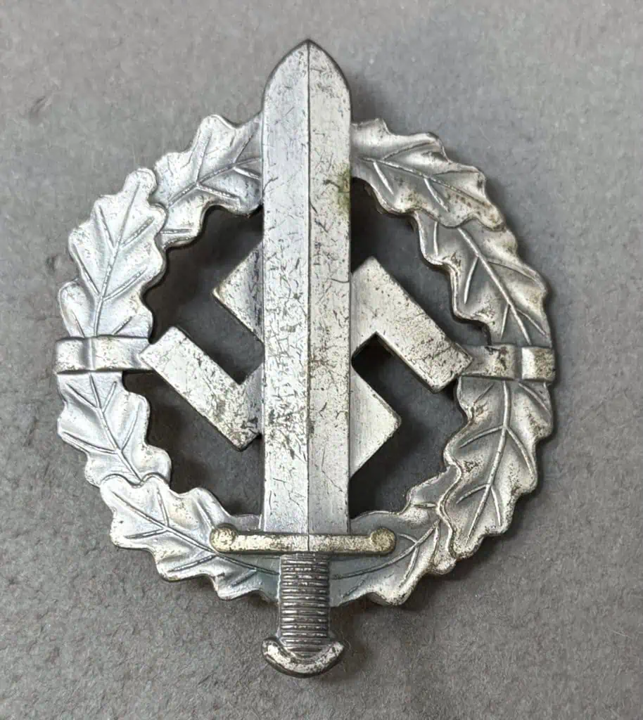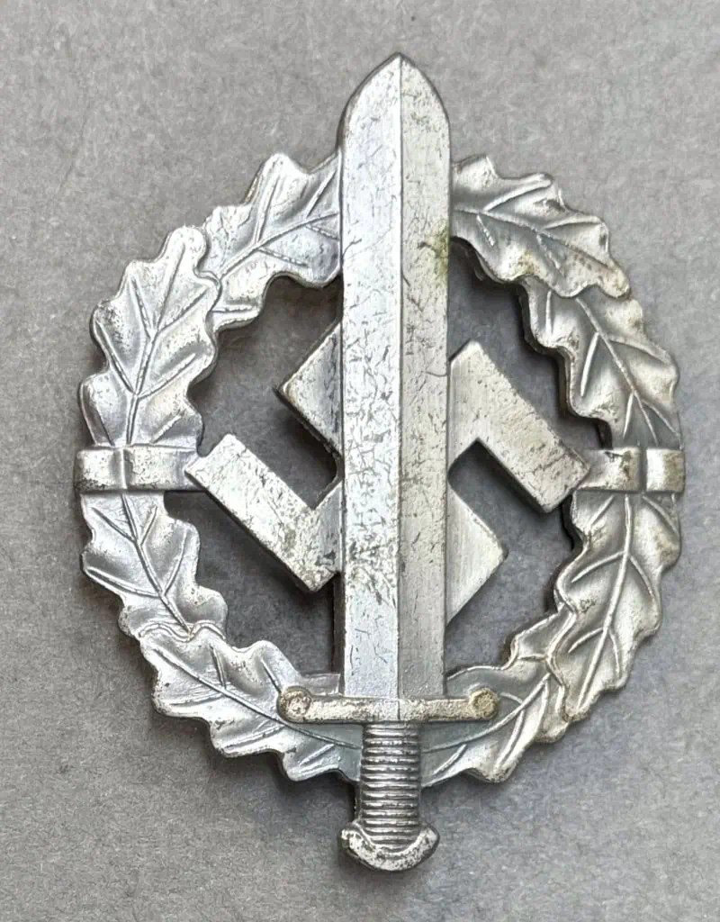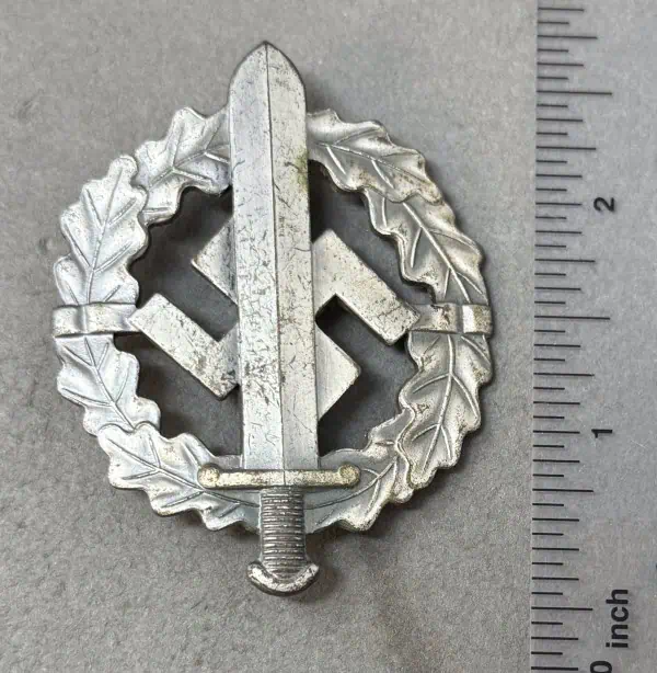 Original German NSDAP (NAZI PARTY) SA/SS Sports Badge In SILVER (SA-Sportabzeichen) Certified. The SA, Sturmabteilung, (Storm/Assault Detachment), was originally formed in the August 1921 as a protective guard unit for the political leaders of the fledgling NSDAP, Nationalsozialistische Deutsche Arbeiterpartei, (National Socialist German Worker’s Party), and as with the NSDAP the SA was structure along para-military lines. The SA recruited most of its personnel from the ranks of the various Freikorps groups composed mainly of disgruntled ex-soldiers and was first utilized at an NSDAP meeting in Munich in November 1921. The SA Sports badge in bronze was instituted by SA-Stabschef Ernst Röhm on November 28TH 1933, for award to SA and SS personnel who passed the required criteria in physical fitness, military defense and field exercises. On February 15TH 1935, in an attempt to inspire the German public to greater levels of physical fitness, Hitler conferred official national status to the badge and expanded it to include a silver and gold grade. When the badges gained official national status, bestowal was opened to all German nationals who were strongly encouraged to qualify for award of one of the three grades. Die struck, metal, badge with a silver wash. The badge is in the form of a circular oak-leaf wreath encompassing an upward pointing Roman broad sword which is superimposed on a central, canted swastika. Detailing includes veins to the oak-leaves, horizontal ribbing to the sword grip and cut-outs to the interior of the circular wreath and swastika arms. Reverse is a mirror image of obverse. Raised soldered catch, semi-rounded vertical pin and soldered catch all intact to reverse. Reverse is well marked with embossed, third pattern inscription, (circa 1939-44), “Eigentum der Obersten S.A. Führung”, (Property of the SA Supreme Command). Reverse also has embossed manufacturers name and location. Excellent example. Some wear and expected issues. Complete museum documentation (COA) Provided. Certified by The Gettysburg Museum of History. The Gettysburg Museum of History does not support or condone Adolf Hitler or the Nazi Party and is only offering this as a historic relic. Please see our other items. Also note when browsing our web site there are several pages of items, at the bottom of the list look for other page numbers. CLASSIC SA Badge. Silver grade is scarce! GOOD CONDTION