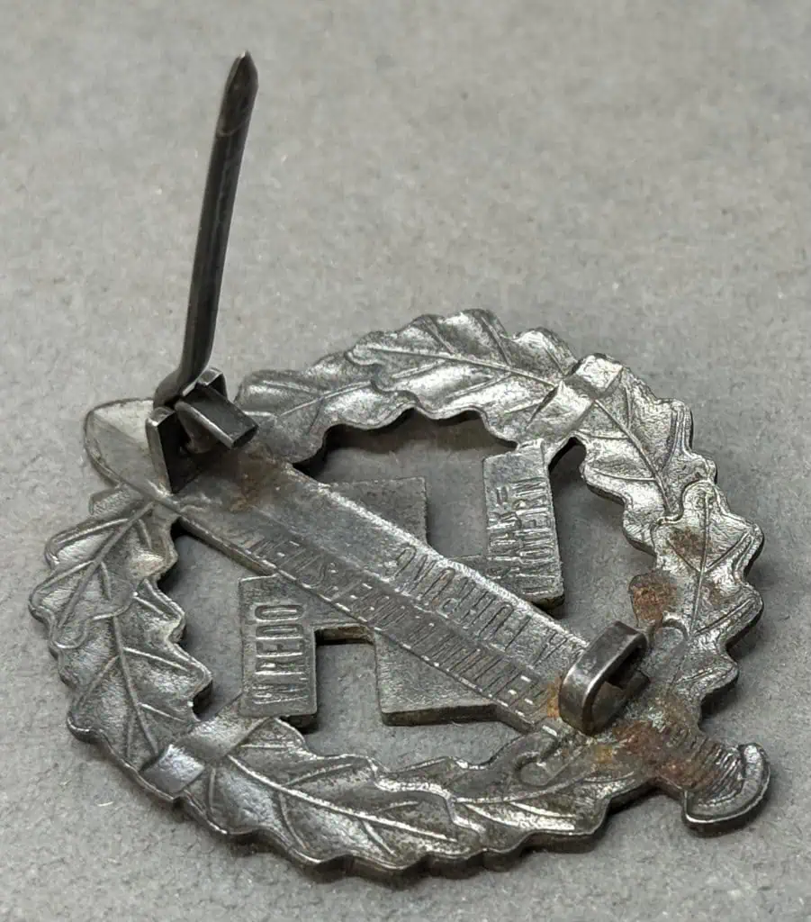 Original German NSDAP (NAZI PARTY) SA/SS Sports Badge In SILVER (SA-Sportabzeichen) Certified. The SA, Sturmabteilung, (Storm/Assault Detachment), was originally formed in the August 1921 as a protective guard unit for the political leaders of the fledgling NSDAP, Nationalsozialistische Deutsche Arbeiterpartei, (National Socialist German Worker’s Party), and as with the NSDAP the SA was structure along para-military lines. The SA recruited most of its personnel from the ranks of the various Freikorps groups composed mainly of disgruntled ex-soldiers and was first utilized at an NSDAP meeting in Munich in November 1921. The SA Sports badge in bronze was instituted by SA-Stabschef Ernst Röhm on November 28TH 1933, for award to SA and SS personnel who passed the required criteria in physical fitness, military defense and field exercises. On February 15TH 1935, in an attempt to inspire the German public to greater levels of physical fitness, Hitler conferred official national status to the badge and expanded it to include a silver and gold grade. When the badges gained official national status, bestowal was opened to all German nationals who were strongly encouraged to qualify for award of one of the three grades. Die struck, metal, badge with a silver wash. The badge is in the form of a circular oak-leaf wreath encompassing an upward pointing Roman broad sword which is superimposed on a central, canted swastika. Detailing includes veins to the oak-leaves, horizontal ribbing to the sword grip and cut-outs to the interior of the circular wreath and swastika arms. Reverse is a mirror image of obverse. Raised soldered catch, semi-rounded vertical pin and soldered catch all intact to reverse. Reverse is well marked with embossed, third pattern inscription, (circa 1939-44), “Eigentum der Obersten S.A. Führung”, (Property of the SA Supreme Command). Reverse also has embossed manufacturers name and location. Excellent example. Some wear and expected issues. Complete museum documentation (COA) Provided. Certified by The Gettysburg Museum of History. The Gettysburg Museum of History does not support or condone Adolf Hitler or the Nazi Party and is only offering this as a historic relic. Please see our other items. Also note when browsing our web site there are several pages of items, at the bottom of the list look for other page numbers. CLASSIC SA Badge. Silver grade is scarce! GOOD CONDTION
