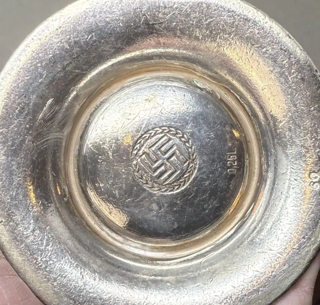Original German NSDAP (Nazi Party) Silver Personal Size Tea Pot Or Large Creamer Marked Hotelbetriebsges.m.b.H Brought Home By A U.S. Veteran Certified. From the Nazi Party ran hotel in Austria Hotel Salzburger Hof. With Nazi Party markings. Marked Hotelbetriebsges.m.b.H. Small scratches. Marked GEBR. HEPP 90. Third Reich silver service piece from the most famous hotel in Austria (then part of Germany) during the Hitler era Silver service articles used in the dining room of the Hof were manufactured by the well-known metals manufacturing firm Gebrüder Hepp of Pforzheim, Germany, south of Heidelberg. Very much to Hitler’s liking, the silver service pieces were plain, classic, heavy bordered, heavy weight silver plated Alpaca metal bearing a logo of a wreath with an outlined swastika in the center. The dish is silvered nickel, At one side we see, clearly marked”. There is also the wreathed swastika indicated the hotel was owned by the Party. On the opposite side is the maker’s mark, “Gebr Hepp 90”, the latter indicating silver plating. It measures just about 7 inches across, with the edges rolled upward. Shows the expected age, wear and use. In good but used condition . Some tarnish on the inside. Gettysburg Museum Certified (COA) provided. 100% Guaranteed to be authentic brought home by a U.S. Veteran. Sold for historic purposes only. See our other pieces on our web site. Also note when browsing our web site there are several pages of items, at the bottom of the list look for other page numbers. EXCELLENT UNTOUCHED OUTSTANDING Veteran Bringback EXAMPLE! DO NOT MISS THIS!